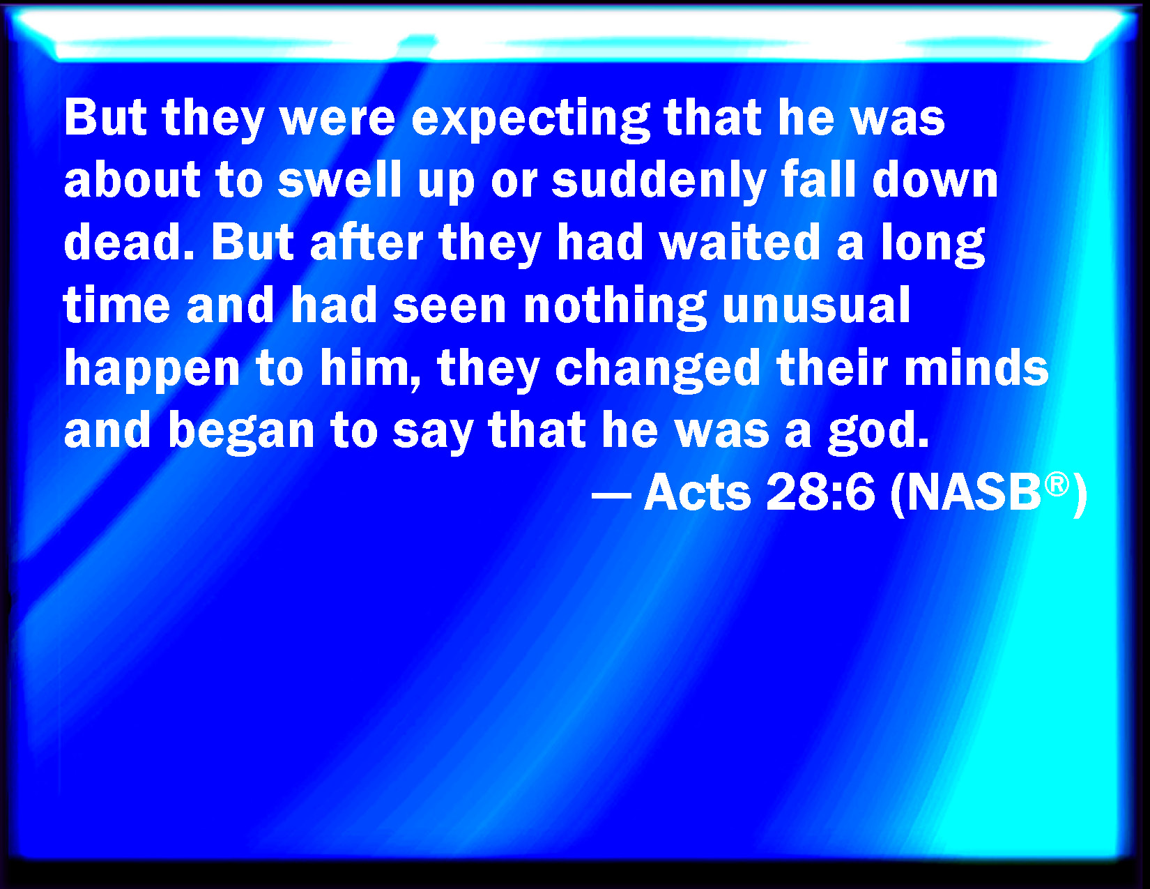 Bible Verse Slide Acts 28:6 However, they looked when he should have swollen, or fallen down dead suddenly: but after they had looked a great while, and saw no harm come to him, they changed their minds, and said that he was a god. KJV: Howbeit they looked when he should have swollen, or fallen down dead suddenly: but after they had looked a great while, and saw no harm come to him, they changed their minds, and said that he was a god. DRB: But they supposed that he would begin to swell up, and that he would suddenly fall down and die. But expecting long, and seeing that there came no harm to him, changing their minds, they said, that he was a god. DBT: But they expected that he would have swollen or fallen down suddenly dead. But when they had expected a long time and saw nothing unusual happen to him, changing their opinion, they said he was a god. ERV: But they expected that he would have swollen, or fallen down dead suddenly: but when they were long in expectation, and beheld nothing amiss came to him, they changed their minds, and said that he was a god. WBT: Yet they looked when he would have swelled, or fallen down dead suddenly: but after they had looked a great while, and saw no harm come to him, they changed their minds, and said that he was a god. WEB: But they expected that he would have swollen or fallen down dead suddenly, but when they watched for a long time and saw nothing bad happen to him, they changed their minds, and said that he was a god. YLT: and they were expecting him to be about to be inflamed, or to fall down suddenly dead, and they, expecting it a long time, and seeing nothing uncommon happening to him, changing their minds, said he was a god.Links Acts 28:6 NIV • Acts 28:6 NLT • Acts 28:6 ESV • Acts 28:6 NASB • Acts 28:6 KJV • Acts 28:6 Interlinear • Acts 28:6 Commentaries • Acts 28:6 Parallel Texts • Acts 28:6 Bible Apps • Acts 28:6 Parallel • Bible Hub |