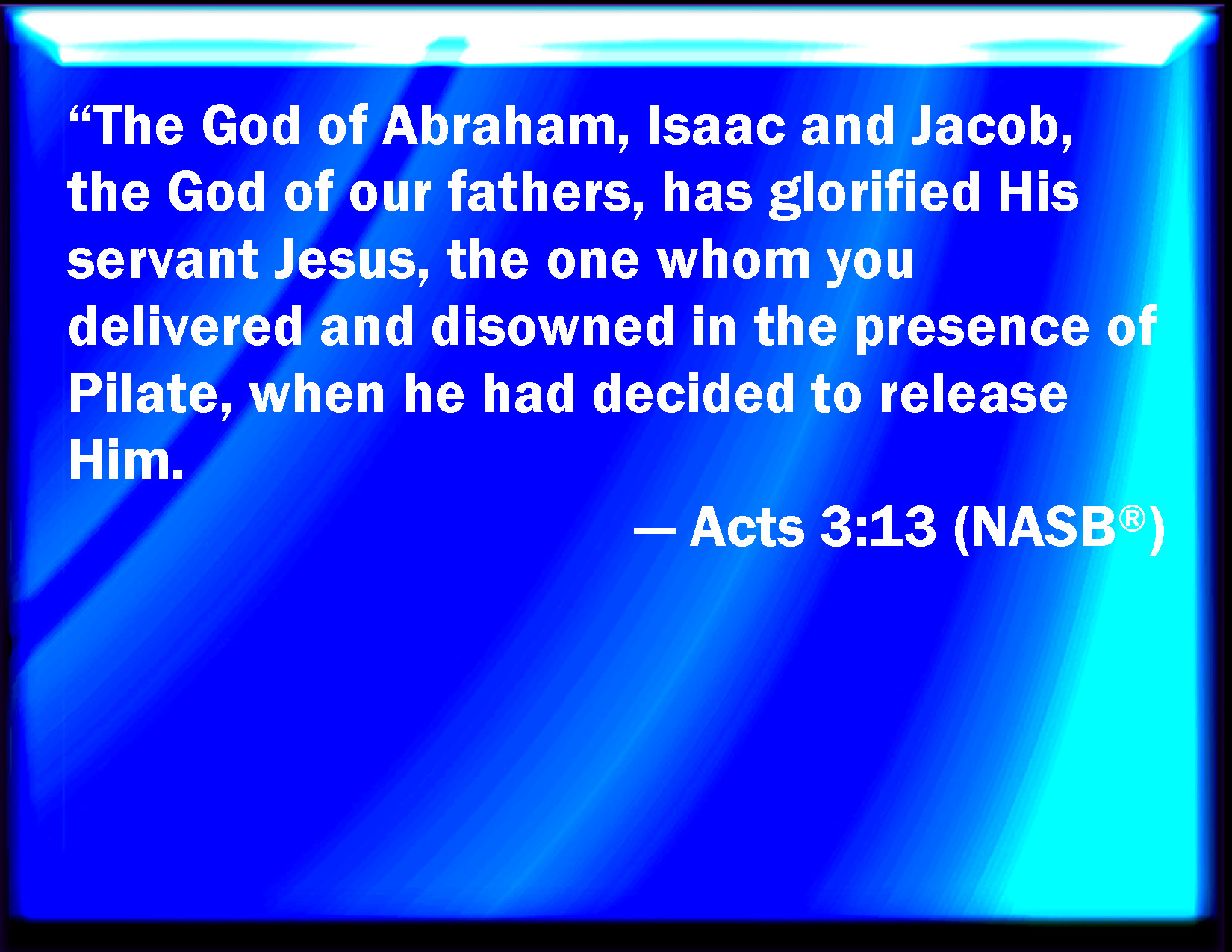 Bible Verse Slide Acts 3:13 The God of Abraham, and of Isaac, and of Jacob, the God of our fathers, has glorified his Son Jesus; whom you delivered up, and denied him in the presence of Pilate, when he was determined to let him go. KJV: The God of Abraham, and of Isaac, and of Jacob, the God of our fathers, hath glorified his Son Jesus; whom ye delivered up, and denied him in the presence of Pilate, when he was determined to let him go. DRB: The God of Abraham, and the God of Isaac, and the God of Jacob, the God of our fathers, hath glorified his Son Jesus, whom you indeed delivered up and denied before the face of Pilate, when he judged he should be released. DBT: The God of Abraham and Isaac and Jacob, the God of our fathers, has glorified his servant Jesus, whom ye delivered up, and denied him in the presence of Pilate, when he had judged that he should be let go. ERV: The God of Abraham, and of Isaac, and of Jacob, the God of our fathers, hath glorified his Servant Jesus; whom ye delivered up, and denied before the face of Pilate, when he had determined to release him. WBT: The God of Abraham, and of Isaac, and of Jacob, the God of our fathers hath glorified his Son Jesus; whom ye delivered up, and denied him in the presence of Pilate, when he was determined to let him go. WEB: The God of Abraham, Isaac, and Jacob, the God of our fathers, has glorified his Servant Jesus, whom you delivered up, and denied in the presence of Pilate, when he had determined to release him. YLT: The God of Abraham, and of Isaac, and of Jacob, the God of our fathers, did glorify His child Jesus, whom ye delivered up, and denied him in the presence of Pilate, he having given judgment to release him,Links Acts 3:13 NIV • Acts 3:13 NLT • Acts 3:13 ESV • Acts 3:13 NASB • Acts 3:13 KJV • Acts 3:13 Interlinear • Acts 3:13 Commentaries • Acts 3:13 Parallel Texts • Acts 3:13 Bible Apps • Acts 3:13 Parallel • Bible Hub |