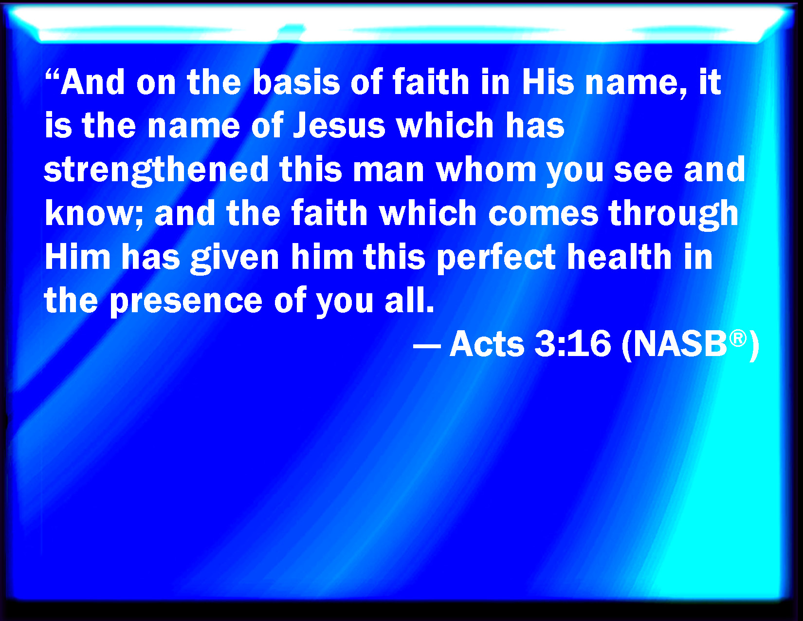 Bible Verse Slide Acts 3:16 And his name through faith in his name has made this man strong, whom you see and know: yes, the faith which is by him has given him this perfect soundness in the presence of you all. KJV: And his name through faith in his name hath made this man strong, whom ye see and know: yea, the faith which is by him hath given him this perfect soundness in the presence of you all. DRB: And in the faith of his name, this man, whom you have seen and known, hath his name strengthened; and the faith which is by him, hath given this perfect soundness in the sight of you all. DBT: And, by faith in his name, his name has made this man strong whom ye behold and know; and the faith which is by him has given him this complete soundness in the presence of you all. ERV: And by faith in his name hath his name made this man strong, whom ye behold and know: yea, the faith which is through him hath given him this perfect soundness in the presence of you all. WBT: And his name, through faith in his name, hath made this man strong, whom ye see and know: yes, the faith which is by him, hath given him this perfect soundness in the presence of you all. WEB: By faith in his name, his name has made this man strong, whom you see and know. Yes, the faith which is through him has given him this perfect soundness in the presence of you all. YLT: and on the faith of his name, this one whom ye see and have known, his name made strong, even the faith that is through him did give to him this perfect soundness before you all.Links Acts 3:16 NIV • Acts 3:16 NLT • Acts 3:16 ESV • Acts 3:16 NASB • Acts 3:16 KJV • Acts 3:16 Interlinear • Acts 3:16 Commentaries • Acts 3:16 Parallel Texts • Acts 3:16 Bible Apps • Acts 3:16 Parallel • Bible Hub |