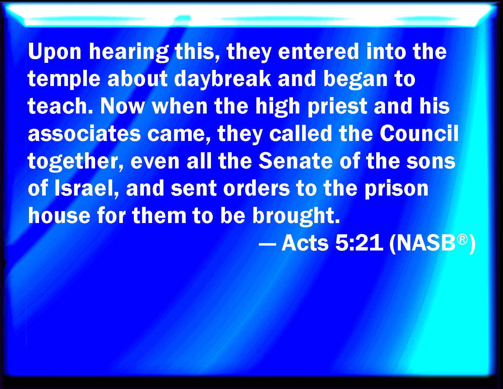 Bible Verse Slide Acts 5:21 And when they heard that, they entered into the temple early in the morning, and taught. But the high priest came, and they that were with him, and called the council together, and all the senate of the children of Israel, and sent to the prison to have them brought. KJV: And when they heard that, they entered into the temple early in the morning, and taught. But the high priest came, and they that were with him, and called the council together, and all the senate of the children of Israel, and sent to the prison to have them brought. DRB: Who having heard this, early in the morning, entered into the temple, and taught. And the high priest coming, and they that were with him, called together the council, and all the ancients of the children of Israel; and they sent to the prison to have them brought. DBT: And when they heard it, they entered very early into the temple and taught. And when the high priest was come, and they that were with him, they called together the council and all the elderhood of the sons of Israel, and sent to the prison to have them brought. ERV: And when they heard this, they entered into the temple about daybreak, and taught. But the high priest came, and they that were with him, and called the council together, and all the senate of the children of Israel, and sent to the prison-house to have them brought. WBT: And when they heard that, they entered into the temple early in the morning, and taught. But the high priest came, and they that were with him, and called the council together, and all the senate of the children of Israel, and sent to the prison to have them brought. WEB: When they heard this, they entered into the temple about daybreak, and taught. But the high priest came, and those who were with him, and called the council together, and all the senate of the children of Israel, and sent to the prison to have them brought. YLT: and having heard, they did enter at the dawn into the temple, and were teaching. And the chief priest having come, and those with him, they called together the sanhedrim and all the senate of the sons of Israel, and they sent to the prison to have them brought,Links Acts 5:21 NIV • Acts 5:21 NLT • Acts 5:21 ESV • Acts 5:21 NASB • Acts 5:21 KJV • Acts 5:21 Interlinear • Acts 5:21 Commentaries • Acts 5:21 Parallel Texts • Acts 5:21 Bible Apps • Acts 5:21 Parallel • Bible Hub |