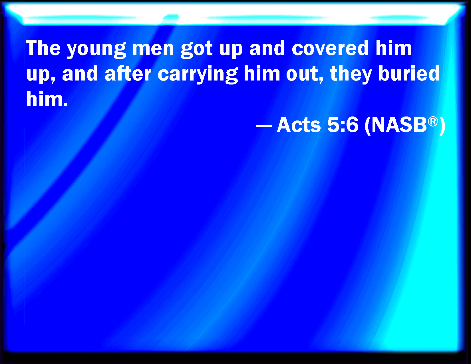 Bible Verse Slide Acts 5:6 And the young men arose, wound him up, and carried him out, and buried him. KJV: And the young men arose, wound him up, and carried him out, and buried him. DRB: And the young men rising up, removed him, and carrying him out, buried him. DBT: And the young men, rising up, swathed him up for burial, and having carried him out, buried him. ERV: And the young men arose and wrapped him round, and they carried him out and buried him. WBT: And the young men arose, wound him up, and carried him out, and buried him. WEB: The young men arose and wrapped him up, and they carried him out and buried him. YLT: and having risen, the younger men wound him up, and having carried forth, they buried him.Links Acts 5:6 NIV • Acts 5:6 NLT • Acts 5:6 ESV • Acts 5:6 NASB • Acts 5:6 KJV • Acts 5:6 Interlinear • Acts 5:6 Commentaries • Acts 5:6 Parallel Texts • Acts 5:6 Bible Apps • Acts 5:6 Parallel • Bible Hub |