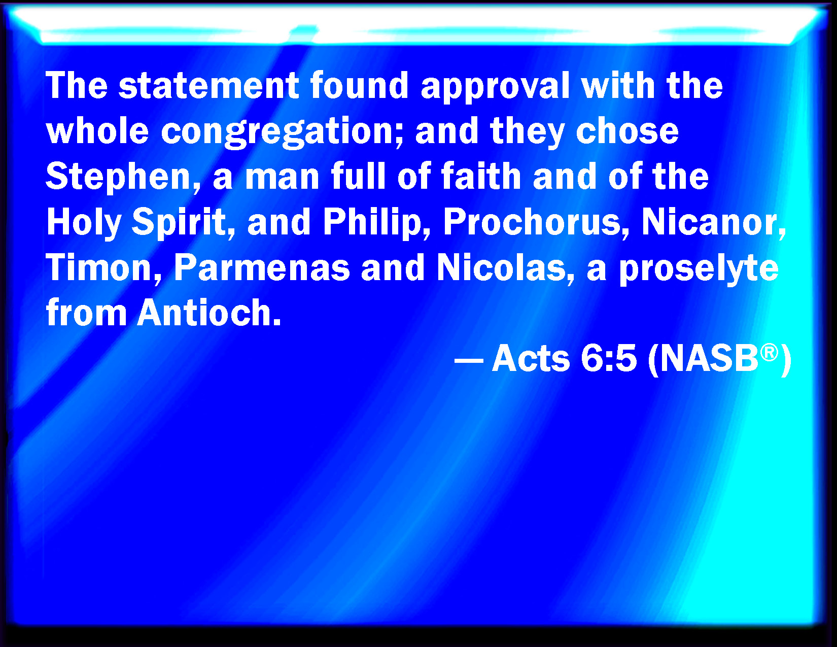 Bible Verse Slide Acts 6:5 And the saying pleased the whole multitude: and they chose Stephen, a man full of faith and of the Holy Ghost, and Philip, and Prochorus, and Nicanor, and Timon, and Parmenas, and Nicolas a proselyte of Antioch: KJV: And the saying pleased the whole multitude: and they chose Stephen, a man full of faith and of the Holy Ghost, and Philip, and Prochorus, and Nicanor, and Timon, and Parmenas, and Nicolas a proselyte of Antioch: DRB: And the saying was liked by all the multitude. And they chose Stephen, a man full of faith, and of the Holy Ghost, and Philip, and Prochorus, and Nicanor, and Timon, and Parmenas, and Nicolas, a proselyte of Antioch. DBT: And the saying pleased the whole multitude: and they chose Stephen, a man full of faith and the Holy Spirit, and Philip, and Prochorus, and Nicanor, and Timon, and Parmenas, and Nicolas, a proselyte of Antioch, ERV: And the saying pleased the whole multitude: and they chose Stephen, a man full of faith and of the Holy Spirit, and Philip, and Prochorus, and Nicanor, and Timon, and Parmenas, and Nicolas a proselyte of Antioch: WBT: And the saying pleased the whole multitude: and they chose Stephen, a man full of faith and of the Holy Spirit, and Philip, and Prochorus, and Nicanor, and Timon, and Parmenas, and Nicolas a proselyte of Antioch: WEB: These words pleased the whole multitude. They chose Stephen, a man full of faith and of the Holy Spirit, Philip, Prochorus, Nicanor, Timon, Parmenas, and Nicolaus, a proselyte of Antioch; YLT: And the thing was pleasing before all the multitude, and they did choose Stephen, a man full of faith and the Holy Spirit, and Philip, and Prochorus, and Nicanor, and Timon, and Parmenas, and Nicolaus, a proselyte of Antioch,Links Acts 6:5 NIV • Acts 6:5 NLT • Acts 6:5 ESV • Acts 6:5 NASB • Acts 6:5 KJV • Acts 6:5 Interlinear • Acts 6:5 Commentaries • Acts 6:5 Parallel Texts • Acts 6:5 Bible Apps • Acts 6:5 Parallel • Bible Hub |