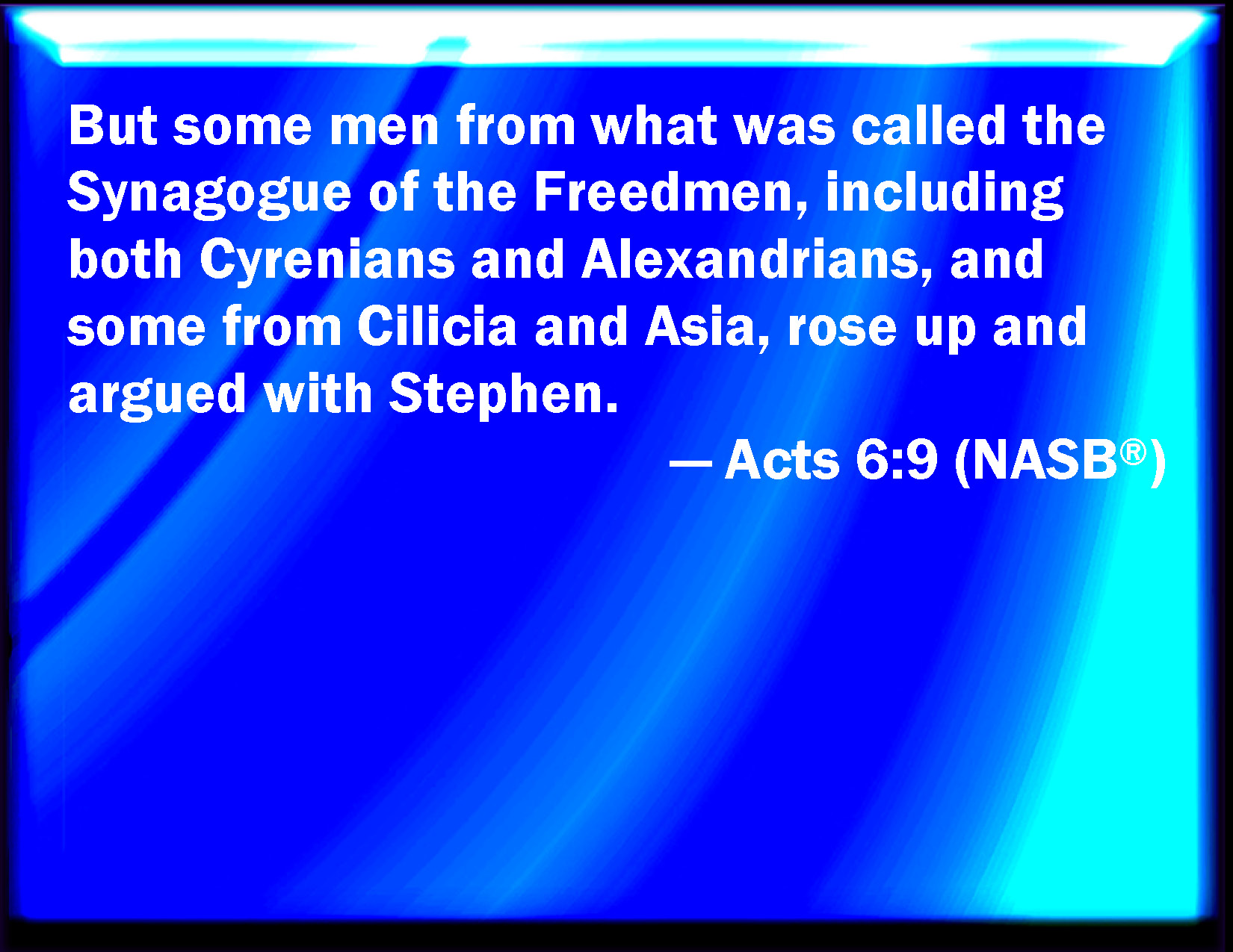 Bible Verse Slide Acts 6:9 Then there arose certain of the synagogue, which is called the synagogue of the Libertines, and Cyrenians, and Alexandrians, and of them of Cilicia and of Asia, disputing with Stephen. KJV: Then there arose certain of the synagogue, which is called the synagogue of the Libertines, and Cyrenians, and Alexandrians, and of them of Cilicia and of Asia, disputing with Stephen. DRB: Now there arose some of that which is called the synagogue of the Libertines, and of the Cyrenians, and of the Alexandrians, and of them that were of Cilicia and Asia, disputing with Stephen. DBT: And there arose up certain of those of the synagogue called of freedmen, and of Cyrenians, and of Alexandrians, and of those of Cilicia and Asia, disputing with Stephen. ERV: But there arose certain of them that were of the synagogue called the synagogue of the Libertines, and of the Cyrenians, and of the Alexandrians, and of them of Cilicia and Asia, disputing with Stephen. WBT: Then there arose certain of the synagogue, which is called the synagogue of the Libertines, and Cyrenians, and Alexandrians, and of them of Cilicia, and of Asia, disputing with Stephen. WEB: But some of those who were of the synagogue called "The Libertines," and of the Cyrenians, of the Alexandrians, and of those of Cilicia and Asia arose, disputing with Stephen. YLT: and there arose certain of those of the synagogue, called of the Libertines, and Cyrenians, and Alexandrians, and of those from Cilicia, and Asia, disputing with Stephen,Links Acts 6:9 NIV • Acts 6:9 NLT • Acts 6:9 ESV • Acts 6:9 NASB • Acts 6:9 KJV • Acts 6:9 Interlinear • Acts 6:9 Commentaries • Acts 6:9 Parallel Texts • Acts 6:9 Bible Apps • Acts 6:9 Parallel • Bible Hub |