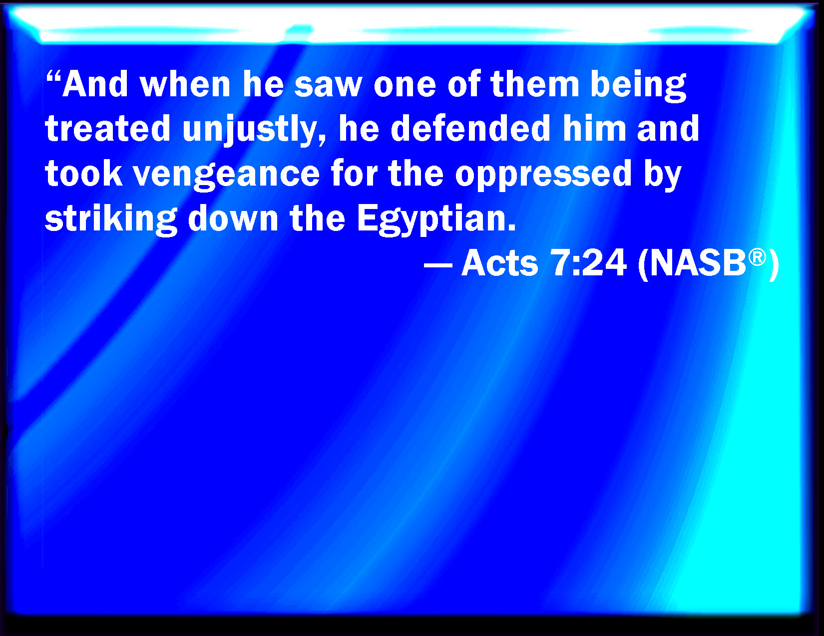 Bible Verse Slide Acts 7:24 And seeing one of them suffer wrong, he defended him, and avenged him that was oppressed, and smote the Egyptian: KJV: And seeing one of them suffer wrong, he defended him, and avenged him that was oppressed, and smote the Egyptian: DRB: And when he had seen one of them suffer wrong, he defended him; and striking the Egyptian, he avenged him who suffered the injury. DBT: and seeing a certain one wronged, he defended him, and avenged him that was being oppressed, smiting the Egyptian. ERV: And seeing one of them suffer wrong, he defended him, and avenged him that was oppressed, smiting the Egyptian: WBT: And seeing one of them suffer wrong, he defended him, and avenged him that was oppressed, and smote the Egyptian: WEB: Seeing one of them suffer wrong, he defended him, and avenged him who was oppressed, striking the Egyptian. YLT: and having seen a certain one suffering injustice, he did defend, and did justice to the oppressed, having smitten the Egyptian;Links Acts 7:24 NIV • Acts 7:24 NLT • Acts 7:24 ESV • Acts 7:24 NASB • Acts 7:24 KJV • Acts 7:24 Interlinear • Acts 7:24 Commentaries • Acts 7:24 Parallel Texts • Acts 7:24 Bible Apps • Acts 7:24 Parallel • Bible Hub |