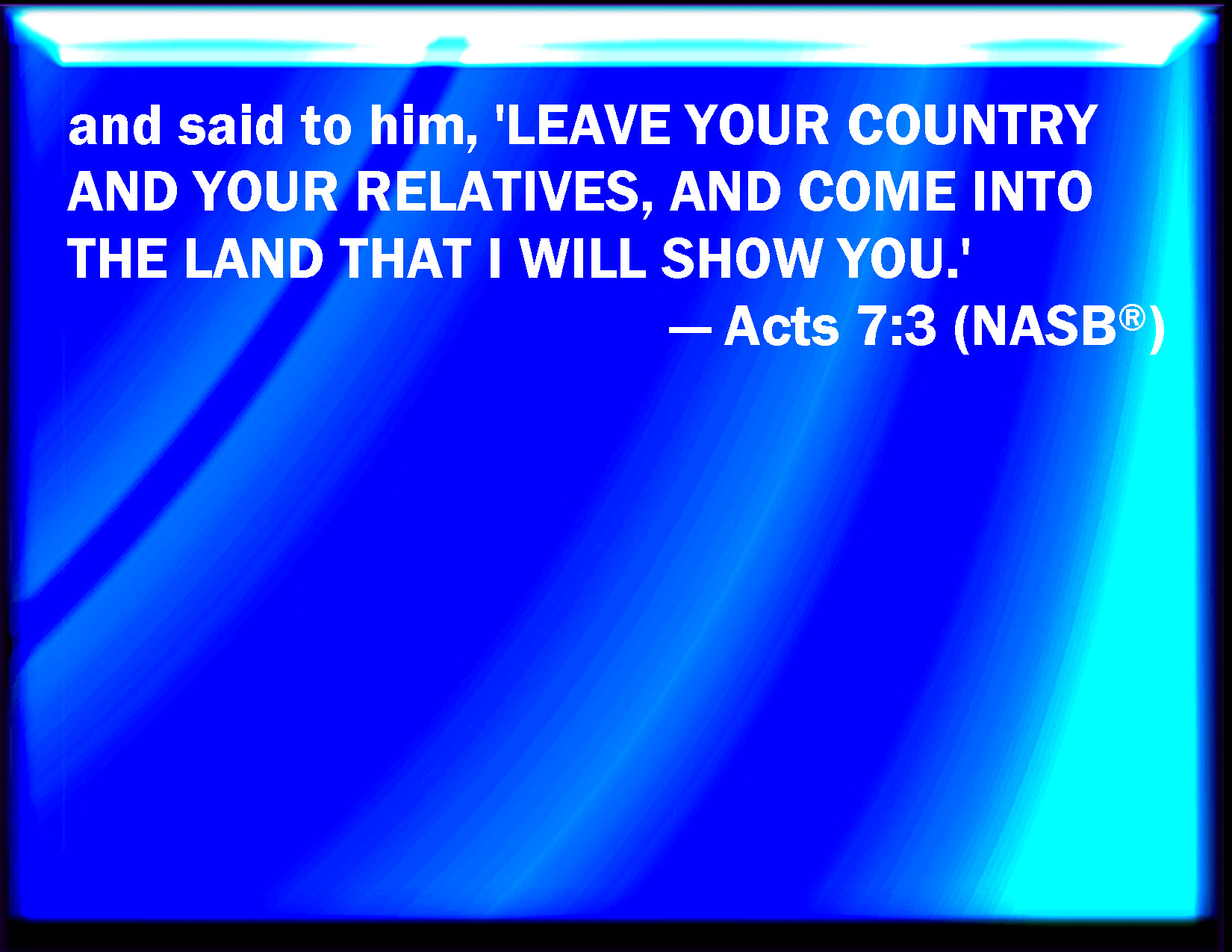 Bible Verse Slide Acts 7:3 And said to him, Get you out of your country, and from your kindred, and come into the land which I shall show you. KJV: And said unto him, Get thee out of thy country, and from thy kindred, and come into the land which I shall shew thee. DRB: And said to him: Go forth out of thy country, and from thy kindred, and come into the land which I shall shew thee. DBT: and said to him, Go out of thy land and out of thy kindred, and come into the land which I will shew thee. ERV: and said unto him, Get thee out of thy land, and from thy kindred, and come into the land which I shall shew thee. WBT: And said to him, Depart from thy country, and from thy kindred, and come into the land which I shall show thee. WEB: and said to him, 'Get out of your land, and from your relatives, and come into a land which I will show you.' YLT: and He said to him, Go forth out of thy land, and out of thy kindred, and come to a land that I shall shew thee.Links Acts 7:3 NIV • Acts 7:3 NLT • Acts 7:3 ESV • Acts 7:3 NASB • Acts 7:3 KJV • Acts 7:3 Interlinear • Acts 7:3 Commentaries • Acts 7:3 Parallel Texts • Acts 7:3 Bible Apps • Acts 7:3 Parallel • Bible Hub |
