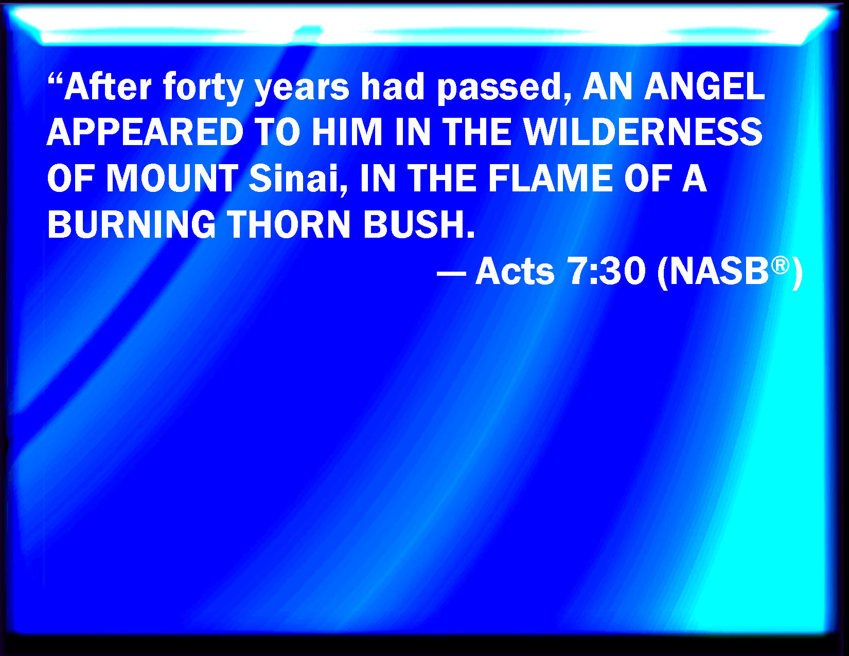 Bible Verse Slide Acts 7:30 And when forty years were expired, there appeared to him in the wilderness of mount Sina an angel of the Lord in a flame of fire in a bush. KJV: And when forty years were expired, there appeared to him in the wilderness of mount Sina an angel of the Lord in a flame of fire in a bush. DRB: And when forty years were expired, there appeared to him in the desert of mount Sina, an angel in a flame of fire in a bush. DBT: And when forty years were fulfilled, an angel appeared to him in the wilderness of mount Sinai, in a flame of fire of a bush. ERV: And when forty years were fulfilled, an angel appeared to him in the wilderness of mount Sinai, in a flame of fire in a bush. WBT: And when forty years had expired, there appeared to him in the wilderness of mount Sina, an angel of the Lord in a flame of fire in a bush. WEB: "When forty years were fulfilled, an angel of the Lord appeared to him in the wilderness of Mount Sinai, in a flame of fire in a bush. YLT: and forty years having been fulfilled, there appeared to him in the wilderness of mount Sinai a messenger of the Lord, in a flame of fire of a bush,Links Acts 7:30 NIV • Acts 7:30 NLT • Acts 7:30 ESV • Acts 7:30 NASB • Acts 7:30 KJV • Acts 7:30 Interlinear • Acts 7:30 Commentaries • Acts 7:30 Parallel Texts • Acts 7:30 Bible Apps • Acts 7:30 Parallel • Bible Hub |