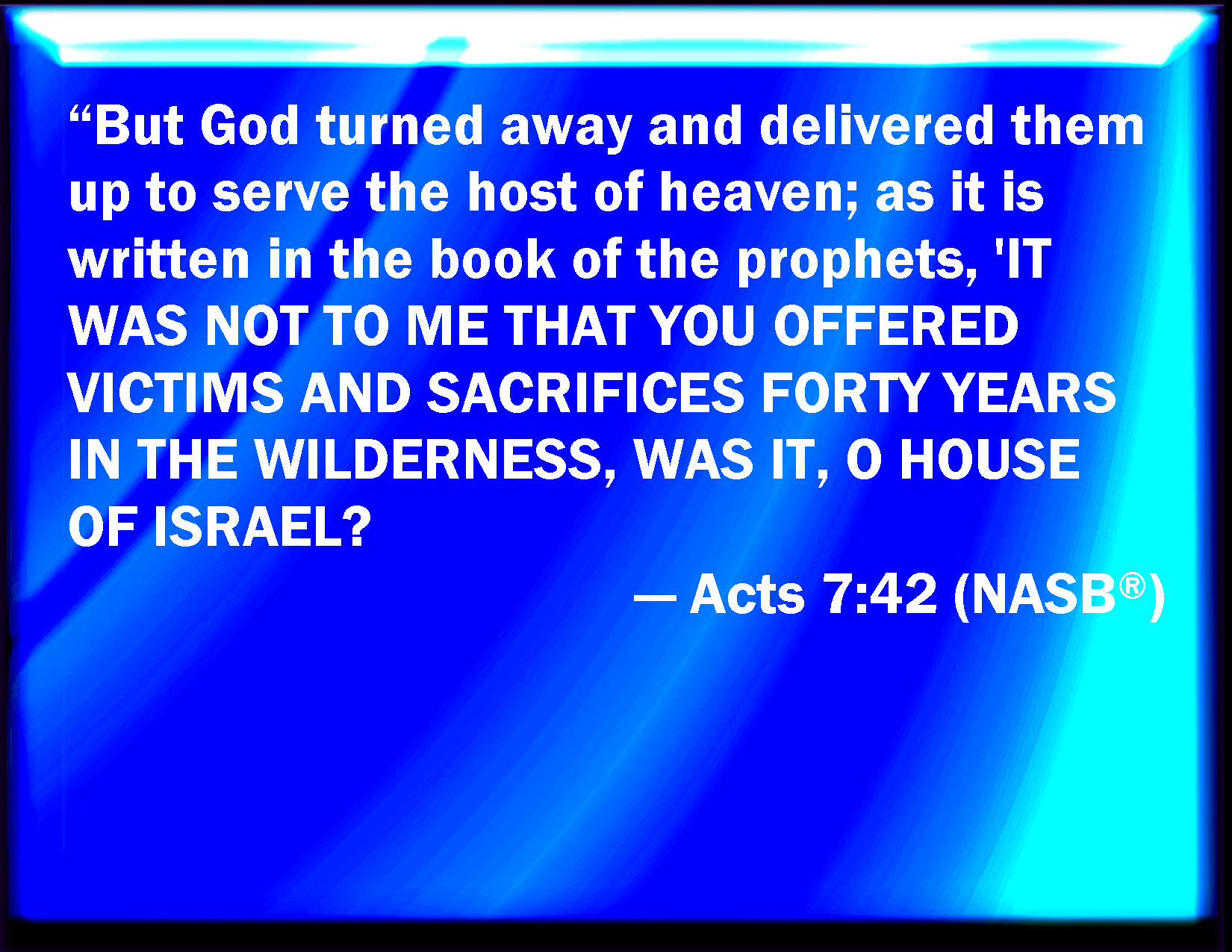 Bible Verse Slide Acts 7:42 Then God turned, and gave them up to worship the host of heaven; as it is written in the book of the prophets, O you house of Israel, have you offered to me slain beasts and sacrifices by the space of forty years in the wilderness? KJV: Then God turned, and gave them up to worship the host of heaven; as it is written in the book of the prophets, O ye house of Israel, have ye offered to me slain beasts and sacrifices by the space of forty years in the wilderness? DRB: And God turned, and gave them up to serve the host of heaven, as it is written in the books of the prophets: Did you offer victims and sacrifices to me for forty years, in the desert, O house of Israel? DBT: But God turned and delivered them up to serve the host of heaven; as it is written in the book of the prophets, Have ye offered me victims and sacrifices forty years in the wilderness, O house of Israel? ERV: But God turned, and gave them up to serve the host of heaven; as it is written in the book of the prophets, Did ye offer unto me slain beasts and sacrifices Forty years in the wilderness, O house of Israel? WBT: Then God turned, and gave them up to worship the host of heaven; as it is written in the book of the prophets, O ye house of Israel, have ye offered to me slain beasts and sacrifices during forty years in the wilderness? WEB: But God turned, and gave them up to serve the army of the sky, as it is written in the book of the prophets, 'Did you offer to me slain animals and sacrifices forty years in the wilderness, O house of Israel? YLT: and God did turn, and did give them up to do service to the host of the heaven, according as it hath been written in the scroll of the prophets: Slain beasts and sacrifices did ye offer to Me forty years in the wilderness, O house of Israel?Links Acts 7:42 NIV • Acts 7:42 NLT • Acts 7:42 ESV • Acts 7:42 NASB • Acts 7:42 KJV • Acts 7:42 Interlinear • Acts 7:42 Commentaries • Acts 7:42 Parallel Texts • Acts 7:42 Bible Apps • Acts 7:42 Parallel • Bible Hub |