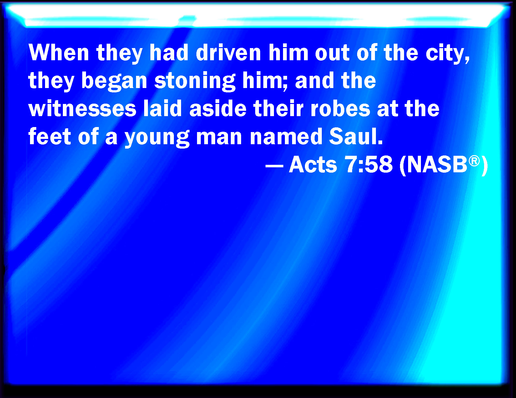 Bible Verse Slide Acts 7:58 And cast him out of the city, and stoned him: and the witnesses laid down their clothes at a young man's feet, whose name was Saul. KJV: And cast him out of the city, and stoned him: and the witnesses laid down their clothes at a young man's feet, whose name was Saul. DRB: And they stoned Stephen, invoking, and saying: Lord Jesus, receive my spirit. DBT: and having cast him out of the city, they stoned him. And the witnesses laid aside their clothes at the feet of a young man called Saul. ERV: and they cast him out of the city, and stoned him: and the witnesses laid down their garments at the feet of a young man named Saul. WBT: And cast him out of the city, and stoned him: and the witnesses laid down their clothes at a young man's feet, whose name was Saul. WEB: They threw him out of the city, and stoned him. The witnesses placed their garments at the feet of a young man named Saul. YLT: and having cast him forth outside of the city, they were stoning him — and the witnesses did put down their garments at the feet of a young man called Saul — Links Acts 7:58 NIV • Acts 7:58 NLT • Acts 7:58 ESV • Acts 7:58 NASB • Acts 7:58 KJV • Acts 7:58 Interlinear • Acts 7:58 Commentaries • Acts 7:58 Parallel Texts • Acts 7:58 Bible Apps • Acts 7:58 Parallel • Bible Hub |