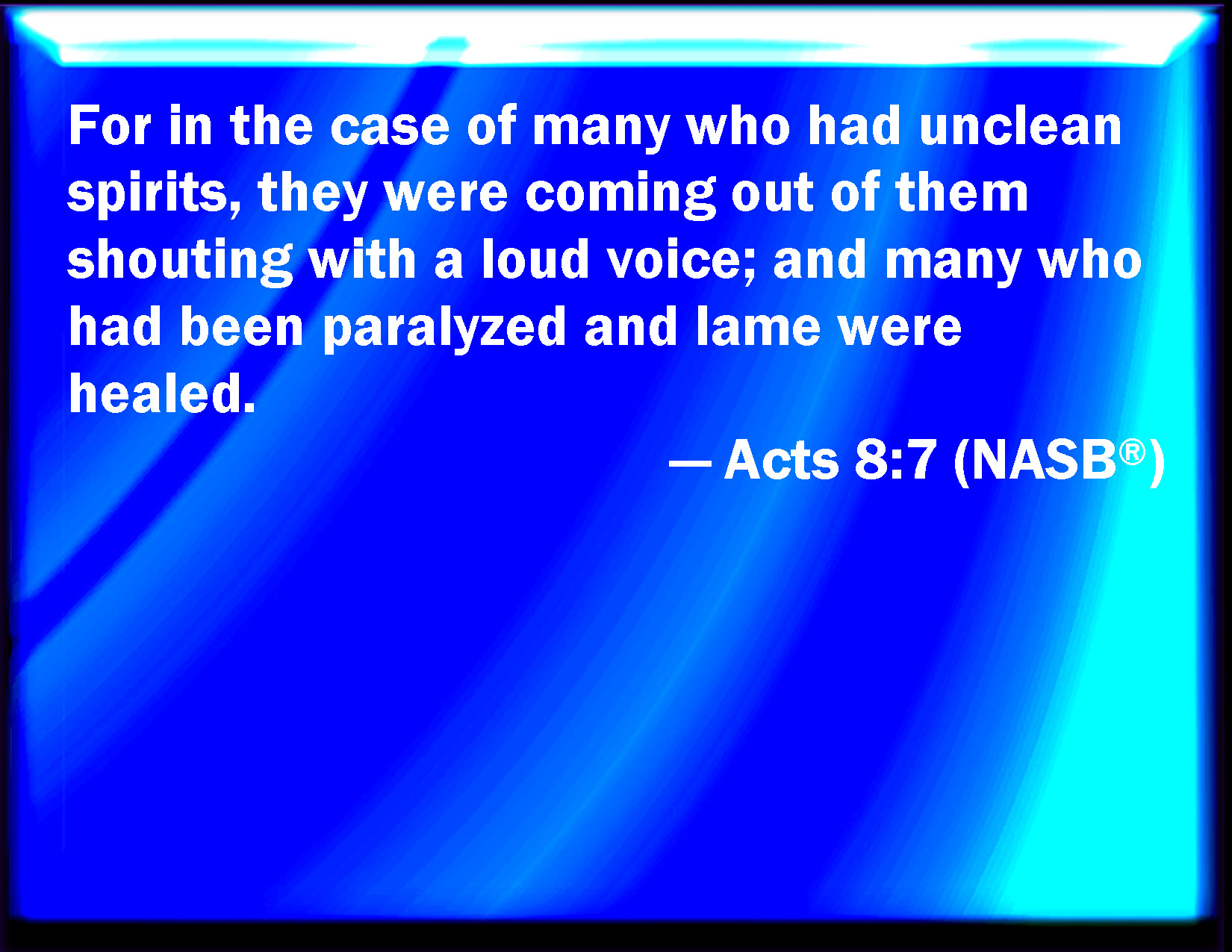 Bible Verse Slide Acts 8:7 For unclean spirits, crying with loud voice, came out of many that were possessed with them: and many taken with palsies, and that were lame, were healed. KJV: For unclean spirits, crying with loud voice, came out of many that were possessed with them: and many taken with palsies, and that were lame, were healed. DRB: For many of them who had unclean spirits, crying with a loud voice, went out. DBT: For from many who had unclean spirits they went out, crying with a loud voice; and many that were paralysed and lame were healed. ERV: For from many of those which had unclean spirits, they came out, crying with a loud voice: and many that were palsied, and that were lame, were healed. WBT: For unclean spirits, crying with loud voice, came out of many that were possessed: and many taken with palsies, and that were lame, were healed. WEB: For unclean spirits came out of many of those who had them. They came out, crying with a loud voice. Many who had been paralyzed and lame were healed. YLT: for unclean spirits came forth from many who were possessed, crying with a loud voice, and many who have been paralytic and lame were healed,Links Acts 8:7 NIV • Acts 8:7 NLT • Acts 8:7 ESV • Acts 8:7 NASB • Acts 8:7 KJV • Acts 8:7 Interlinear • Acts 8:7 Commentaries • Acts 8:7 Parallel Texts • Acts 8:7 Bible Apps • Acts 8:7 Parallel • Bible Hub |