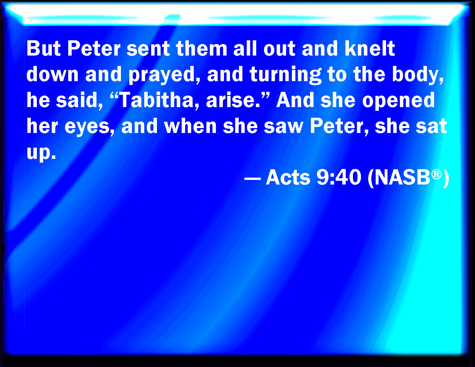 Bible Verse Slide Acts 9:40 But Peter put them all forth, and kneeled down, and prayed; and turning him to the body said, Tabitha, arise. And she opened her eyes: and when she saw Peter, she sat up. KJV: But Peter put them all forth, and kneeled down, and prayed; and turning him to the body said, Tabitha, arise. And she opened her eyes: and when she saw Peter, she sat up. DRB: And they all being put forth, Peter kneeling down prayed, and turning to the body, he said: Tabitha, arise. And she opened her eyes; and seeing Peter, she sat up. DBT: But Peter, putting them all out, and kneeling down, prayed. And, turning to the body, he said, Tabitha, arise. And she opened her eyes, and, seeing Peter, sat up. ERV: But Peter put them all forth, and kneeled down, and prayed; and turning to the body, he said, Tabitha, arise. And she opened her eyes; and when she saw Peter, she sat up. WBT: But Peter put them all forth, and kneeled down, and prayed; and turning to the body, said, Tabitha, arise. And she opened her eyes: and when she saw Peter, she sat up. WEB: Peter put them all out, and kneeled down and prayed. Turning to the body, he said, "Tabitha, get up!" She opened her eyes, and when she saw Peter, she sat up. YLT: And Peter having put them all forth without, having bowed the knees, did pray, and having turned unto the body said, 'Tabitha, arise;' and she opened her eyes, and having seen Peter, she sat up,Links Acts 9:40 NIV • Acts 9:40 NLT • Acts 9:40 ESV • Acts 9:40 NASB • Acts 9:40 KJV • Acts 9:40 Interlinear • Acts 9:40 Commentaries • Acts 9:40 Parallel Texts • Acts 9:40 Bible Apps • Acts 9:40 Parallel • Bible Hub |