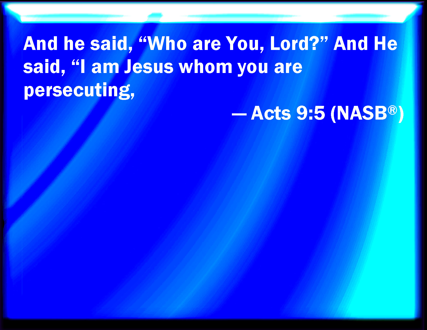 Bible Verse Slide Acts 9:5 And he said, Who are you, Lord? And the Lord said, I am Jesus whom you persecute: it is hard for you to kick against the pricks. KJV: And he said, Who art thou, Lord? And the Lord said, I am Jesus whom thou persecutest: it is hard for thee to kick against the pricks. DRB: Who said: Who art thou, Lord? And he: I am Jesus whom thou persecutest. It is hard for thee to kick against the goad. DBT: And he said, Who art thou, Lord? And he said, I am Jesus, whom thou persecutest. ERV: And he said, Who art thou, Lord? And he said, I am Jesus whom thou persecutest: WBT: And he said, Who art thou, Lord? And the Lord said, I am Jesus whom thou persecutest. It is hard for thee to kick against the goads. WEB: He said, "Who are you, Lord?" The Lord said, "I am Jesus, whom you are persecuting. YLT: And he said, 'Who art thou, Lord?' and the Lord said, 'I am Jesus whom thou dost persecute; hard for thee at the pricks to kick;'Links Acts 9:5 NIV • Acts 9:5 NLT • Acts 9:5 ESV • Acts 9:5 NASB • Acts 9:5 KJV • Acts 9:5 Interlinear • Acts 9:5 Commentaries • Acts 9:5 Parallel Texts • Acts 9:5 Bible Apps • Acts 9:5 Parallel • Bible Hub |