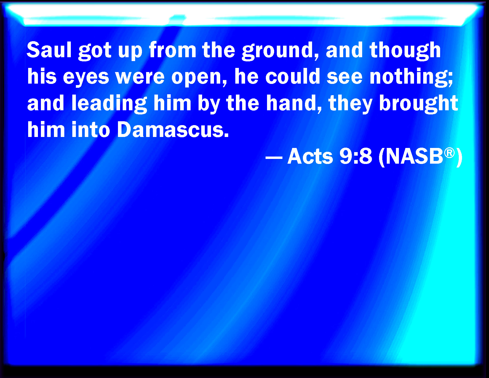 Bible Verse Slide Acts 9:8 And Saul arose from the earth; and when his eyes were opened, he saw no man: but they led him by the hand, and brought him into Damascus. KJV: And Saul arose from the earth; and when his eyes were opened, he saw no man: but they led him by the hand, and brought him into Damascus. DRB: And Saul arose from the ground; and when his eyes were opened, he saw nothing. But they leading him by the hands, brought him to Damascus. DBT: And Saul rose up from the earth, and his eyes being opened he saw no one. But leading him by the hand they brought him into Damascus. ERV: And Saul arose from the earth; and when his eyes were opened, he saw nothing; and they led him by the hand, and brought him into Damascus. WBT: And Saul arose from the earth; and when his eyes were opened, he saw no man: but they led him by the hand, and brought him into Damascus. WEB: Saul arose from the ground, and when his eyes were opened, he saw no one. They led him by the hand, and brought him into Damascus. YLT: and Saul arose from the earth, and his eyes having been opened, he beheld no one, and leading him by the hand they brought him to Damascus,Links Acts 9:8 NIV • Acts 9:8 NLT • Acts 9:8 ESV • Acts 9:8 NASB • Acts 9:8 KJV • Acts 9:8 Interlinear • Acts 9:8 Commentaries • Acts 9:8 Parallel Texts • Acts 9:8 Bible Apps • Acts 9:8 Parallel • Bible Hub |