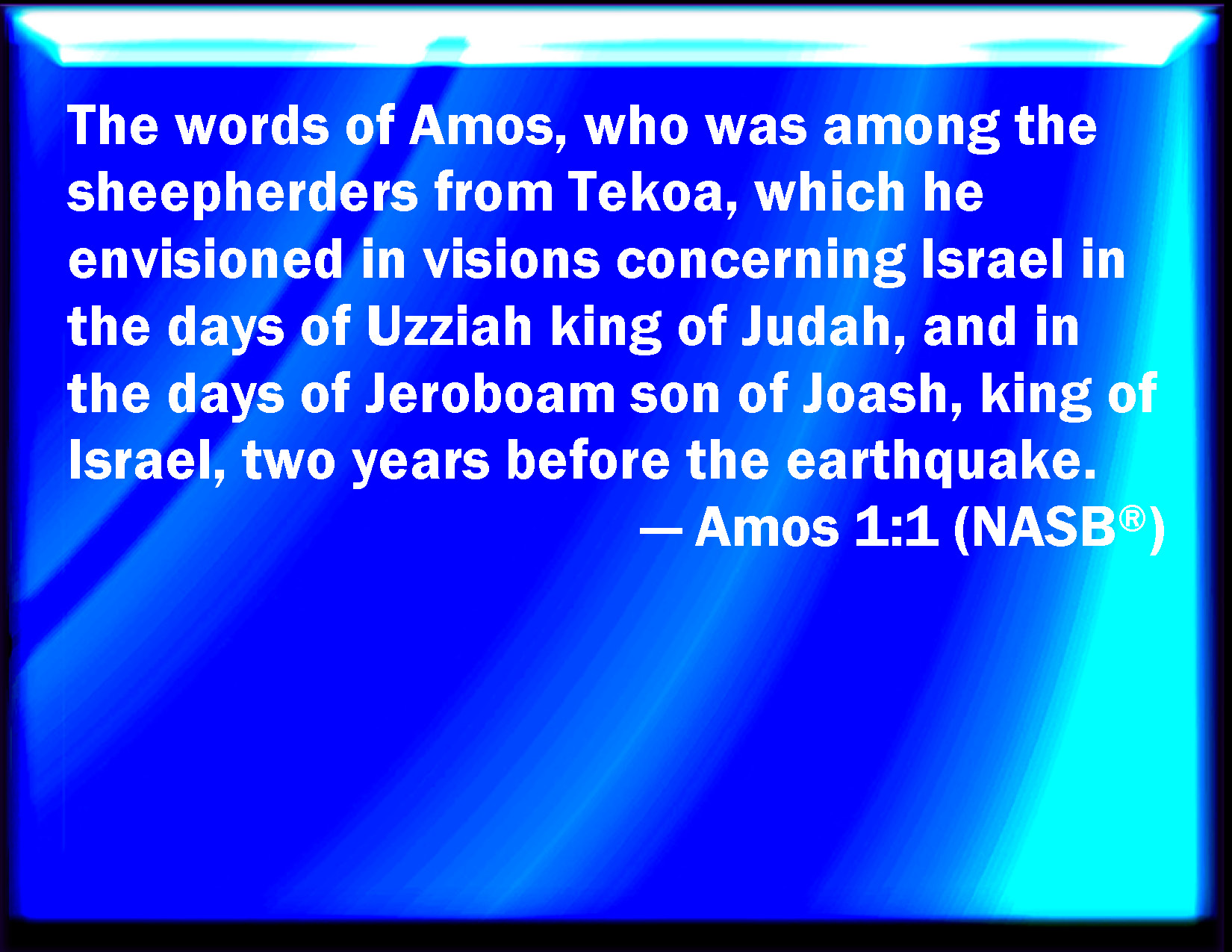 Bible Verse Slide Amos 1:1 The words of Amos, who was among the herdsmen of Tekoa, which he saw concerning Israel in the days of Uzziah king of Judah, and in the days of Jeroboam the son of Joash king of Israel, two years before the earthquake. KJV: The words of Amos, who was among the herdmen of Tekoa, which he saw concerning Israel in the days of Uzziah king of Judah, and in the days of Jeroboam the son of Joash king of Israel, two years before the earthquake. DRB: The words of Amos, who was among herdsmen of Thecua: which he saw concerning Israel in the days of Ozias king of Juda, and in the days of Jeroboam the son of Joas king of Israel two years before the earthquake. DBT: The words of Amos, who was among the herdmen of Tekoa, which he saw concerning Israel in the days of Uzziah king of Judah, and in the days of Jeroboam the son of Joash, king of Israel, two years before the earthquake. ERV: The words of Amos, who was among the herdmen of Tekoa, which he saw concerning Israel in the days of Uzziah king of Judah, and in the days of Jeroboam the son of Joash king of Israel, two years before the earthquake. WBT: The words of Amos, who was among the herdmen of Tekoa, which he saw concerning Israel in the days of Uzziah king of Judah, and in the days of Jeroboam the son of Joash king of Israel, two years before the earthquake. WEB: The words of Amos, who was among the herdsmen of Tekoa, which he saw concerning Israel in the days of Uzziah king of Judah, and in the days of Jeroboam the son of Joash king of Israel, two years before the earthquake. YLT: Words of Amos — who hath been among herdsmen of Tekoa — that he hath seen concerning Israel, in the days of Uzziah king of Judah, and in the days of Jeroboam son of Joash king of Israel, two years before the shaking;Links Amos 1:1 NIV • Amos 1:1 NLT • Amos 1:1 ESV • Amos 1:1 NASB • Amos 1:1 KJV • Amos 1:1 Interlinear • Amos 1:1 Commentaries • Amos 1:1 Parallel Texts • Amos 1:1 Bible Apps • Amos 1:1 Parallel • Bible Hub |