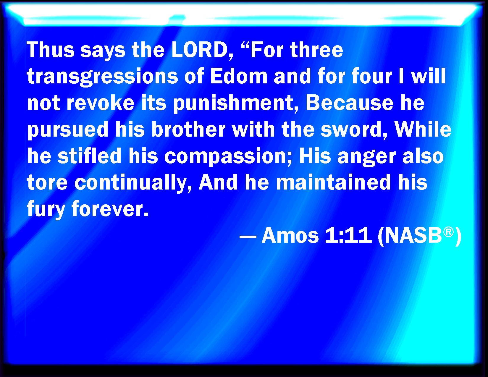 Bible Verse Slide Amos 1:11 Thus said the LORD; For three transgressions of Edom, and for four, I will not turn away the punishment thereof; because he did pursue his brother with the sword, and did cast off all pity, and his anger did tear perpetually, and he kept his wrath for ever: KJV: Thus saith the LORD; For three transgressions of Edom, and for four, I will not turn away the punishment thereof; because he did pursue his brother with the sword, and did cast off all pity, and his anger did tear perpetually, and he kept his wrath for ever: DRB: Thus saith the Lord: For three crimes of Edom, and for four I will not convert him: because he hath pursued his brother with the sword, and hath cast off all pity, and hath carried on his fury, and hath kept his wrath to the end. DBT: Thus saith Jehovah: For three transgressions of Edom, and for four, I will not revoke its sentence; because he pursued his brother with the sword, and cast off all pity; and his anger did tear continually, and he kept his wrath for ever. ERV: Thus saith the LORD: For three transgressions of Edom, yea, for four, I will not turn away the punishment thereof; because he did pursue his brother with the sword, and did cast off all pity, and his anger did tear perpetually, and he kept his wrath for ever: WBT: Thus saith the LORD; For three transgressions of Edom, and for four, I will not turn away its punishment: because he pursued his brother with the sword, and cast off all pity, and his anger did tear perpetually, and he kept his wrath for ever: WEB: Thus says Yahweh: "For three transgressions of Edom, yes, for four, I will not turn away its punishment; because he pursued his brother with the sword, and cast off all pity, and his anger raged continually, and he kept his wrath forever; YLT: Thus said Jehovah: For three transgressions of Edom, And for four, I do not reverse it, Because of his pursuing with a sword his brother, And he hath destroyed his mercies, And tear perpetually doth his anger, And his wrath — he hath kept it for ever,Links Amos 1:11 NIV • Amos 1:11 NLT • Amos 1:11 ESV • Amos 1:11 NASB • Amos 1:11 KJV • Amos 1:11 Interlinear • Amos 1:11 Commentaries • Amos 1:11 Parallel Texts • Amos 1:11 Bible Apps • Amos 1:11 Parallel • Bible Hub |