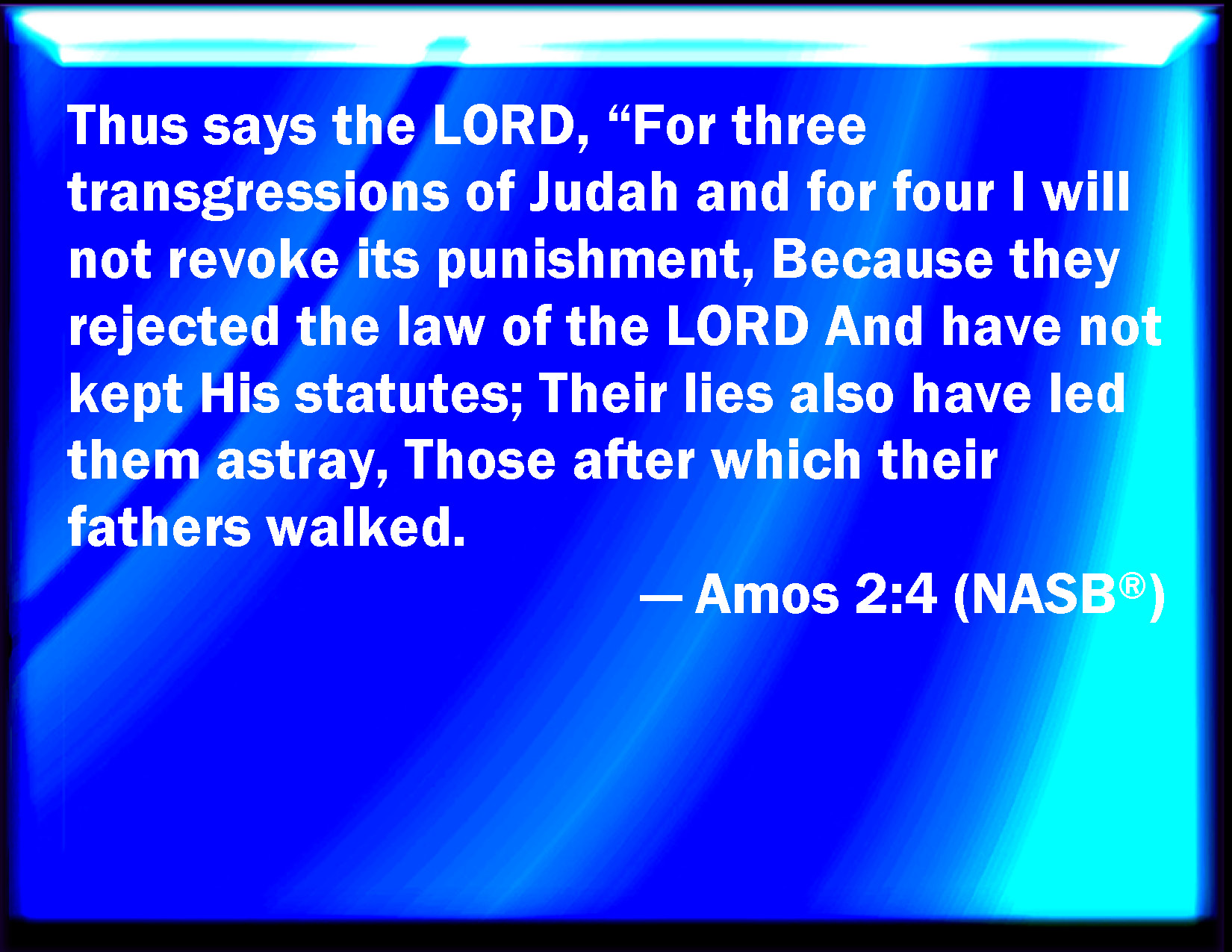 Bible Verse Slide Amos 2:4 Thus said the LORD; For three transgressions of Judah, and for four, I will not turn away the punishment thereof; because they have despised the law of the LORD, and have not kept his commandments, and their lies caused them to err, after the which their fathers have walked: KJV: Thus saith the LORD; For three transgressions of Judah, and for four, I will not turn away the punishment thereof; because they have despised the law of the LORD, and have not kept his commandments, and their lies caused them to err, after the which their fathers have walked: DRB: Thus saith the Lord: For three crimes of Juda, and for four I will not convert him: because he hath cast away the law of the Lord, and hath not kept his commandments: for their idols have caused them to err, after which their fathers have walked. DBT: Thus saith Jehovah: For three transgressions of Judah, and for four, I will not revoke its sentence; because they have despised the law of Jehovah, and have not kept his statutes; and their lies have caused them to err, after which their fathers walked. ERV: Thus saith the LORD: For three transgressions of Judah, yea, for four, I will not turn away the punishment thereof; because they have rejected the law of the LORD, and have not kept his statutes, and their lies have caused them to err, after the which their fathers did walk: WBT: Thus saith the LORD; For three transgressions of Judah, and for four, I will not turn away their punishment: because they have despised the law of the LORD, and have not kept his commandments, and their lies caused them to err, after which their fathers have walked: WEB: Thus says Yahweh: "For three transgressions of Judah, yes, for four, I will not turn away its punishment; because they have rejected Yahweh's law, and have not kept his statutes, and their lies have led them astray, after which their fathers walked; YLT: Thus said Jehovah: For three transgressions of Judah, And for four, I do not reserve it, Because of their loathing the law of Jehovah, And His statutes they have not kept, And their lies do cause them to err, After which their fathers did walk,Links Amos 2:4 NIV • Amos 2:4 NLT • Amos 2:4 ESV • Amos 2:4 NASB • Amos 2:4 KJV • Amos 2:4 Interlinear • Amos 2:4 Commentaries • Amos 2:4 Parallel Texts • Amos 2:4 Bible Apps • Amos 2:4 Parallel • Bible Hub |