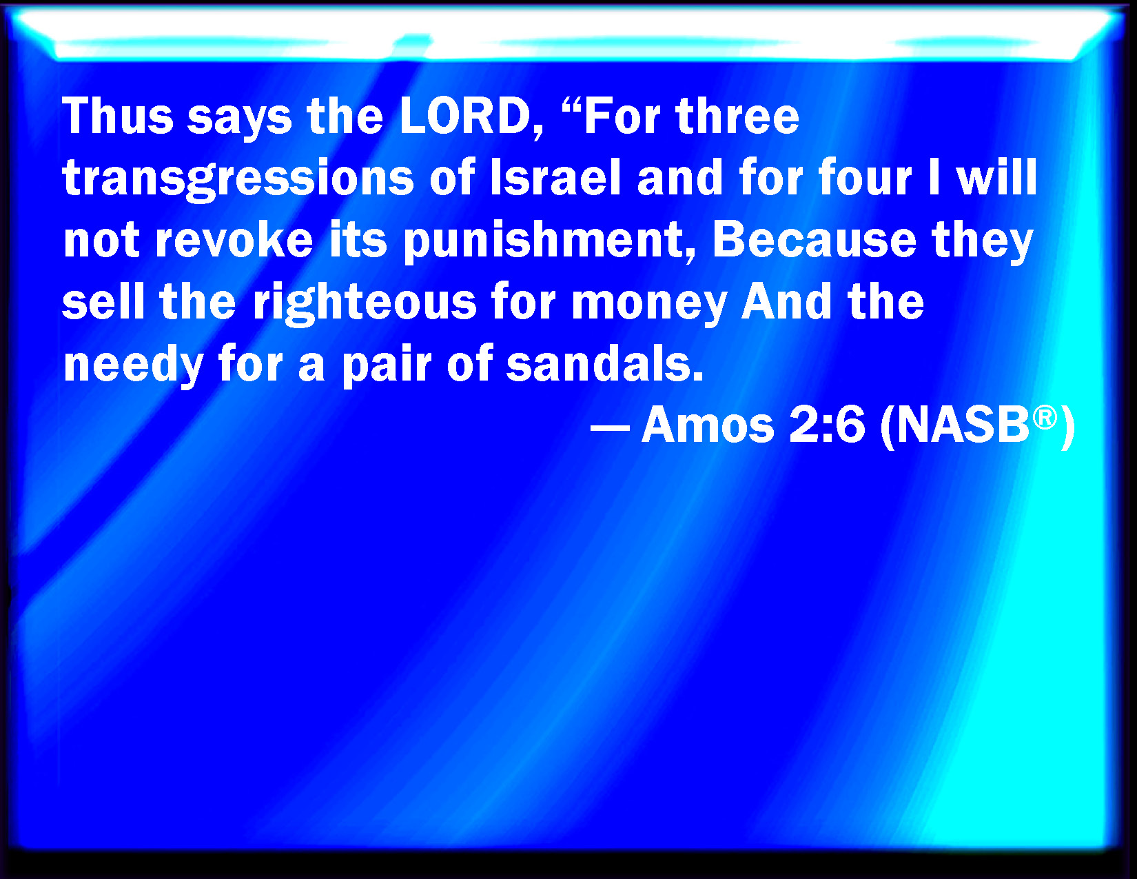 Bible Verse Slide Amos 2:6 Thus said the LORD; For three transgressions of Israel, and for four, I will not turn away the punishment thereof; because they sold the righteous for silver, and the poor for a pair of shoes; KJV: Thus saith the LORD; For three transgressions of Israel, and for four, I will not turn away the punishment thereof; because they sold the righteous for silver, and the poor for a pair of shoes; DRB: Thus saith the Lord: For three crimes of Israel, and for four I will not convert him: because he hath sold the just man for silver, and the poor man for a pair of shoes. DBT: Thus saith Jehovah: For three transgressions of Israel, and for four, I will not revoke its sentence; because they have sold the righteous for silver, and the needy for a pair of shoes; ERV: Thus saith the LORD: For three transgressions of Israel, yea, for four, I will not turn away the punishment thereof; because they have sold the righteous for silver and the needy for a pair of shoes: WBT: Thus saith the LORD; For three transgressions of Israel, and for four, I will not turn away their punishment: because they sold the righteous for silver, and the poor for a pair of shoes; WEB: Thus says Yahweh: "For three transgressions of Israel, yes, for four, I will not turn away its punishment; because they have sold the righteous for silver, and the needy for a pair of shoes; YLT: Thus said Jehovah: For three transgressions of Israel, And for four, I do not reverse it, Because of their selling for silver the righteous, And the needy for a pair of sandals.Links Amos 2:6 NIV • Amos 2:6 NLT • Amos 2:6 ESV • Amos 2:6 NASB • Amos 2:6 KJV • Amos 2:6 Interlinear • Amos 2:6 Commentaries • Amos 2:6 Parallel Texts • Amos 2:6 Bible Apps • Amos 2:6 Parallel • Bible Hub |
