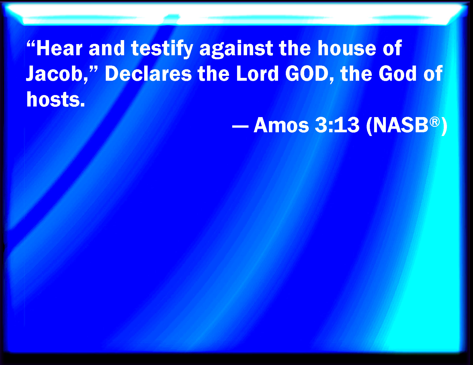 Bible Verse Slide Amos 3:13 Hear you, and testify in the house of Jacob, said the Lord GOD, the God of hosts, KJV: Hear ye, and testify in the house of Jacob, saith the Lord GOD, the God of hosts, DRB: Hear ye, and testify in the house of Jacob, saith the Lord the God of hosts: DBT: Hear ye, and testify in the house of Jacob, saith the Lord Jehovah, the God of hosts, ERV: Hear ye, and testify against the house of Jacob, saith the Lord GOD, the God of hosts. WBT: Hear ye, and testify in the house of Jacob, saith the Lord GOD, the God of hosts, WEB: "Listen, and testify against the house of Jacob," says the Lord Yahweh, the God of Armies. YLT: Hear ye and testify to the house of Jacob, An affirmation of the Lord Jehovah, God of Hosts.Links Amos 3:13 NIV • Amos 3:13 NLT • Amos 3:13 ESV • Amos 3:13 NASB • Amos 3:13 KJV • Amos 3:13 Interlinear • Amos 3:13 Commentaries • Amos 3:13 Parallel Texts • Amos 3:13 Bible Apps • Amos 3:13 Parallel • Bible Hub |