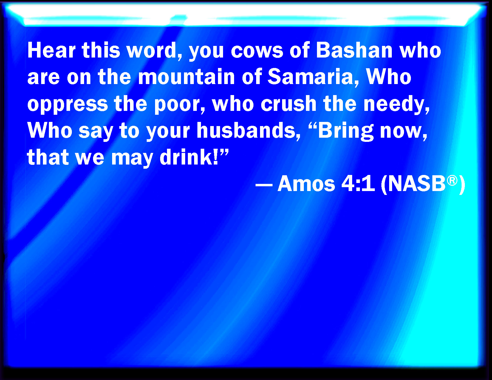 Bible Verse Slide Amos 4:1 Hear this word, you cows of Bashan, that are in the mountain of Samaria, which oppress the poor, which crush the needy, which say to their masters, Bring, and let us drink. KJV: Hear this word, ye kine of Bashan, that are in the mountain of Samaria, which oppress the poor, which crush the needy, which say to their masters, Bring, and let us drink. DRB: Hear this word, ye fat kine that are in the mountains of Samaria: you that oppress the needy, and crush the poor: that say to your masters: Bring, and we will drink. DBT: Hear this word, ye kine of Bashan, that are in the mountain of Samaria, that oppress the poor, that crush the needy, that say to their lords, Bring, and let us drink: ERV: Hear this word, ye kine of Bashan, that are in the mountain of Samaria, which oppress the poor, which crush the needy, which say unto their lords, Bring, and let us drink. WBT: Hear this word, ye heifers of Bashan, that are in the mountain of Samaria, which oppress the poor, which crush the needy, which say to their masters, Bring, and let us drink. WEB: Listen to this word, you cows of Bashan, who are on the mountain of Samaria, who oppress the poor, who crush the needy, who tell their husbands, "Bring us drinks!" YLT: Hear this word, ye kine of Bashan, Who are in the mountain of Samaria, Who are oppressing the poor, Who are bruising the needy, Who are saying to their lords: 'Bring in, and we do drink.'Links Amos 4:1 NIV • Amos 4:1 NLT • Amos 4:1 ESV • Amos 4:1 NASB • Amos 4:1 KJV • Amos 4:1 Interlinear • Amos 4:1 Commentaries • Amos 4:1 Parallel Texts • Amos 4:1 Bible Apps • Amos 4:1 Parallel • Bible Hub |