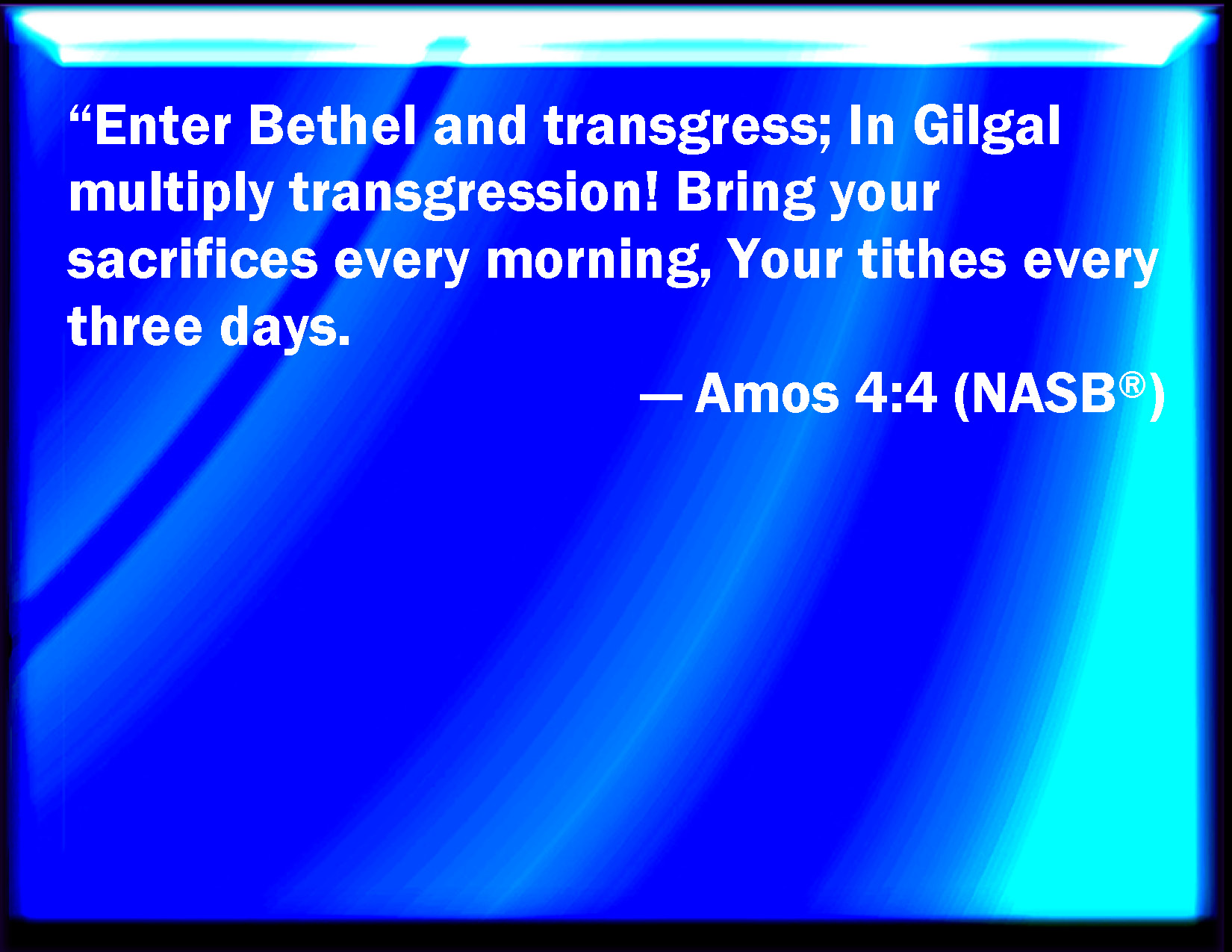 Bible Verse Slide Amos 4:4 Come to Bethel, and transgress; at Gilgal multiply transgression; and bring your sacrifices every morning, and your tithes after three years: KJV: Come to Bethel, and transgress; at Gilgal multiply transgression; and bring your sacrifices every morning, and your tithes after three years: DRB: Come ye to Bethel, and do wickedly: to Galgal, and multiply transgressions: and bring in the morning your victims, your tithes in three days. DBT: Come to Bethel, and transgress; at Gilgal multiply transgression; and bring your sacrifices in the morning, your tithes every three days, ERV: Come to Beth-el, and transgress; to Gilgal, and multiply transgression; and bring your sacrifices every morning, and your tithes every three days; WBT: Come to Beth-el and transgress; at Gilgal multiply transgression; and bring your sacrifices every morning, and your tithes after three years: WEB: "Go to Bethel, and sin; to Gilgal, and sin more. Bring your sacrifices every morning, your tithes every three days, YLT: Enter ye Beth-El, and transgress, At Gilgal multiply transgression, And bring in every morning your sacrifices, Every third year your tithes.Links Amos 4:4 NIV • Amos 4:4 NLT • Amos 4:4 ESV • Amos 4:4 NASB • Amos 4:4 KJV • Amos 4:4 Interlinear • Amos 4:4 Commentaries • Amos 4:4 Parallel Texts • Amos 4:4 Bible Apps • Amos 4:4 Parallel • Bible Hub |