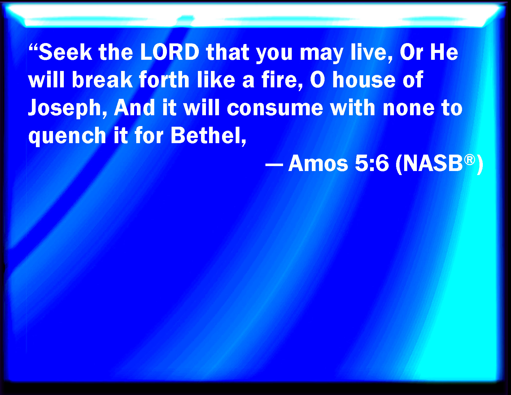 Bible Verse Slide Amos 5:6 Seek the LORD, and you shall live; lest he break out like fire in the house of Joseph, and devour it, and there be none to quench it in Bethel. KJV: Seek the LORD, and ye shall live; lest he break out like fire in the house of Joseph, and devour it, and there be none to quench it in Bethel. DRB: Seek ye the Lord, and live: lest the house of Joseph be burnt with fire, and it shall devour, and there shall be none to quench Bethel. DBT: Seek Jehovah, and ye shall live; lest he break out like fire in the house of Joseph, and devour it, and there be none to quench it in Bethel. ERV: Seek the LORD, and ye shall live; lest he break out like fire in the house of Joseph, and it devour and there be none to quench it in Beth-el: WBT: Seek the LORD, and ye shall live; lest he break out like fire in the house of Joseph, and devour it, and there be none to quench it in Beth-el. WEB: Seek Yahweh, and you will live; lest he break out like fire in the house of Joseph, and it devour, and there be no one to quench it in Bethel. YLT: Seek ye Jehovah, and live, Lest He prosper as fire against the house of Joseph, And it hath consumed, And there is no quencher for Beth-El.Links Amos 5:6 NIV • Amos 5:6 NLT • Amos 5:6 ESV • Amos 5:6 NASB • Amos 5:6 KJV • Amos 5:6 Interlinear • Amos 5:6 Commentaries • Amos 5:6 Parallel Texts • Amos 5:6 Bible Apps • Amos 5:6 Parallel • Bible Hub |