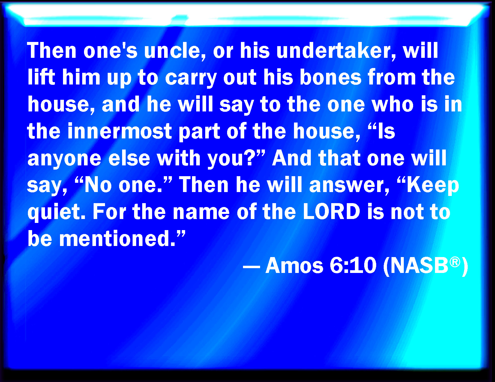 Bible Verse Slide Amos 6:10 And a man's uncle shall take him up, and he that burns him, to bring out the bones out of the house, and shall say to him that is by the sides of the house, Is there yet any with you? and he shall say, No. Then shall he say, Hold your tongue: for we may not make mention of the name of the LORD. KJV: And a man's uncle shall take him up, and he that burneth him, to bring out the bones out of the house, and shall say unto him that is by the sides of the house, Is there yet any with thee? and he shall say, No. Then shall he say, Hold thy tongue: for we may not make mention of the name of the LORD. DRB: And a man's kinsman shall take him up, and shall burn him, that he may carry the bones out of the house; and he shall say to him that is in the inner rooms of the house: Is there yet any with thee? And he shall answer: There is an end. And he shall any to him: Hold thy peace, and mention not the name of the Lord. DBT: And a man's uncle, and he that should burn him, shall take him up to bring out the bones from the house, and shall say unto him that is in the inner parts of the house, Is there yet any with thee? and he shall say, None. And he will say, Silence! for we may not make mention of Jehovah's name. ERV: And when a man's uncle shall take him up, even he that burneth him, to bring out the bones out of the house, and shall say unto him that is in the innermost parts of the house, Is there yet any with thee? and he shall say, No; then shall he say, Hold thy peace; for we may not make mention of the name of the LORD. WBT: And a man's uncle shall take him up, and he that burneth him, to bring the bones out of the house, and shall say to him that is by the sides of the house, Is there yet any with thee? and he shall say, No. Then shall he say, Hold thy tongue: for we may not make mention of the name of the LORD. WEB: "When a man's relative carries him, even he who burns him, to bring bodies out of the house, and asks him who is in the innermost parts of the house, 'Is there yet any with you?' And he says, 'No;' then he will say, 'Hush! Indeed we must not mention the name of Yahweh.' YLT: And lifted him up hath his loved one, even his burner, To bring forth the bones from the house, And he said to him who is in the sides of the house, 'Is there yet with thee?' And he said, 'None,' then he said, 'Hush! Save to make mention of the name of Jehovah.'Links Amos 6:10 NIV • Amos 6:10 NLT • Amos 6:10 ESV • Amos 6:10 NASB • Amos 6:10 KJV • Amos 6:10 Interlinear • Amos 6:10 Commentaries • Amos 6:10 Parallel Texts • Amos 6:10 Bible Apps • Amos 6:10 Parallel • Bible Hub |