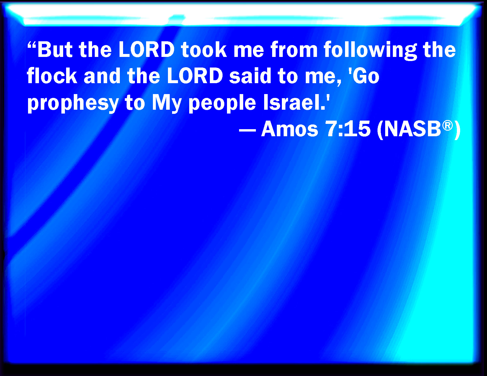Bible Verse Slide Amos 7:15 And the LORD took me as I followed the flock, and the LORD said to me, Go, prophesy to my people Israel. KJV: And the LORD took me as I followed the flock, and the LORD said unto me, Go, prophesy unto my people Israel. DRB: And the Lord took me when I followed the flock, and the Lord said to me: Go, prophesy to my people Israel. DBT: And Jehovah took me as I followed the flock, and Jehovah said unto me, Go, prophesy unto my people Israel. ERV: and the LORD took me from following the flock, and the LORD said unto me, Go, prophesy unto my people Israel. WBT: And the LORD took me as I followed the flock, and the LORD said to me, Go, prophesy to my people Israel. WEB: and Yahweh took me from following the flock, and Yahweh said to me, 'Go, prophesy to my people Israel.' YLT: and Jehovah taketh me from after the flock, and Jehovah saith unto me, Go, prophesy unto My people Israel.Links Amos 7:15 NIV • Amos 7:15 NLT • Amos 7:15 ESV • Amos 7:15 NASB • Amos 7:15 KJV • Amos 7:15 Interlinear • Amos 7:15 Commentaries • Amos 7:15 Parallel Texts • Amos 7:15 Bible Apps • Amos 7:15 Parallel • Bible Hub |