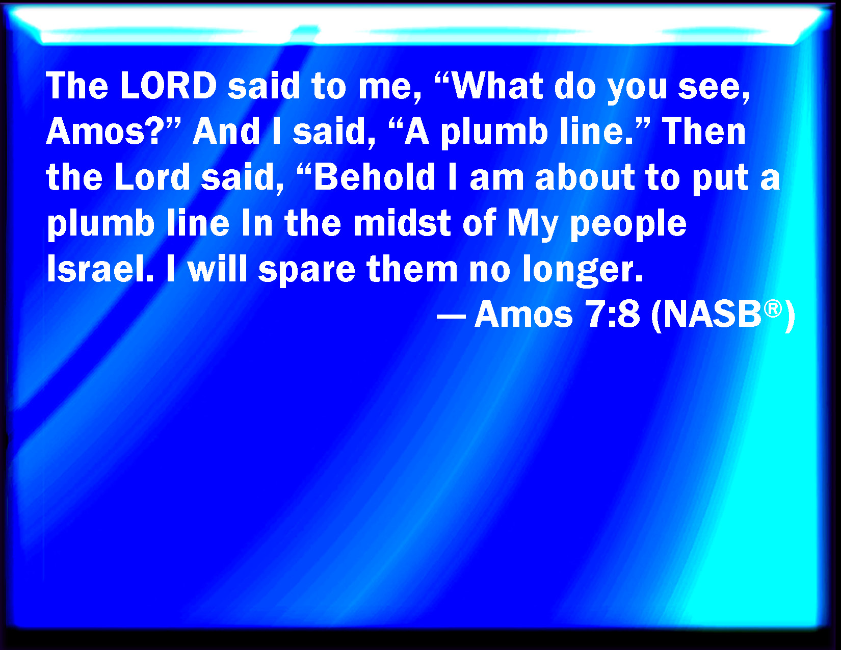 Bible Verse Slide Amos 7:8 And the LORD said to me, Amos, what see you? And I said, A plumb line. Then said the LORD, Behold, I will set a plumb line in the middle of my people Israel: I will not again pass by them any more: KJV: And the LORD said unto me, Amos, what seest thou? And I said, A plumbline. Then said the Lord, Behold, I will set a plumbline in the midst of my people Israel: I will not again pass by them any more: DRB: And the Lord said to me: What seest thou, Amos? And I said: A mason's trowel. And the Lord said: Behold, I will lay down the trowel in the midst of my people Israel. I will plaster them over no more. DBT: And Jehovah said unto me, Amos, what seest thou? And I said, A plumb-line. And the Lord said, Behold, I will set a plumb-line in the midst of my people Israel: I will not again pass by them any more. ERV: And the LORD said unto me, Amos, what seest thou? And I said, A plumbline. Then said the Lord, Behold, I will set a plumbline in the midst of my people Israel; I will not again pass by them any more: WBT: And the LORD said to me, Amos, what seest thou? and I said, A plumb-line. Then said the Lord, Behold, I will set a plumb-line in the midst of my people Israel: I will not again pass by them any more: WEB: Yahweh said to me, "Amos, what do you see?" I said, "A plumb line." Then the Lord said, "Behold, I will set a plumb line in the midst of my people Israel. I will not again pass by them any more. YLT: and Jehovah saith unto me, 'What art thou seeing, Amos?' And I say, 'A plumb-line;' and the Lord saith: 'Lo, I am setting a plumb-line in the midst of My people Israel, I do not add any more to pass over to it.Links Amos 7:8 NIV • Amos 7:8 NLT • Amos 7:8 ESV • Amos 7:8 NASB • Amos 7:8 KJV • Amos 7:8 Interlinear • Amos 7:8 Commentaries • Amos 7:8 Parallel Texts • Amos 7:8 Bible Apps • Amos 7:8 Parallel • Bible Hub |