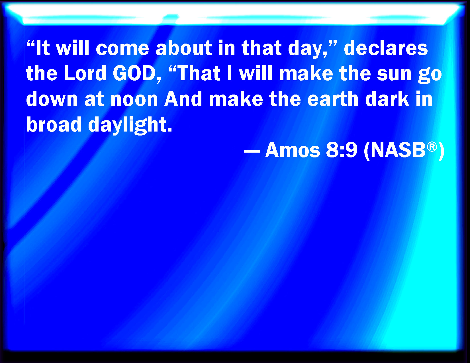 Bible Verse Slide Amos 8:9 And it shall come to pass in that day, said the Lord GOD, that I will cause the sun to go down at noon, and I will darken the earth in the clear day: KJV: And it shall come to pass in that day, saith the Lord GOD, that I will cause the sun to go down at noon, and I will darken the earth in the clear day: DRB: And it shall come to pass in that day, saith the Lord God, that the sun shall go down at midday, and I will make the earth dark in the day of light: DBT: And it shall come to pass in that day, saith the Lord Jehovah, that I will cause the sun to go down at noon, and I will darken the land in the clear day. ERV: And it shall come to pass in that day, saith the Lord GOD, that I will cause the sun to go down at noon, and I will darken the earth in the clear day. WBT: And it shall come to pass in that day, saith the Lord GOD, that I will cause the sun to go down at noon, and I will darken the earth in the clear day: WEB: It will happen in that day," says the Lord Yahweh, "that I will cause the sun to go down at noon, and I will darken the earth in the clear day. YLT: And it hath come to pass in that day, An affirmation of the Lord Jehovah, I have caused the sun to go in at noon, And caused darkness on the land in a day of light,Links Amos 8:9 NIV • Amos 8:9 NLT • Amos 8:9 ESV • Amos 8:9 NASB • Amos 8:9 KJV • Amos 8:9 Interlinear • Amos 8:9 Commentaries • Amos 8:9 Parallel Texts • Amos 8:9 Bible Apps • Amos 8:9 Parallel • Bible Hub |