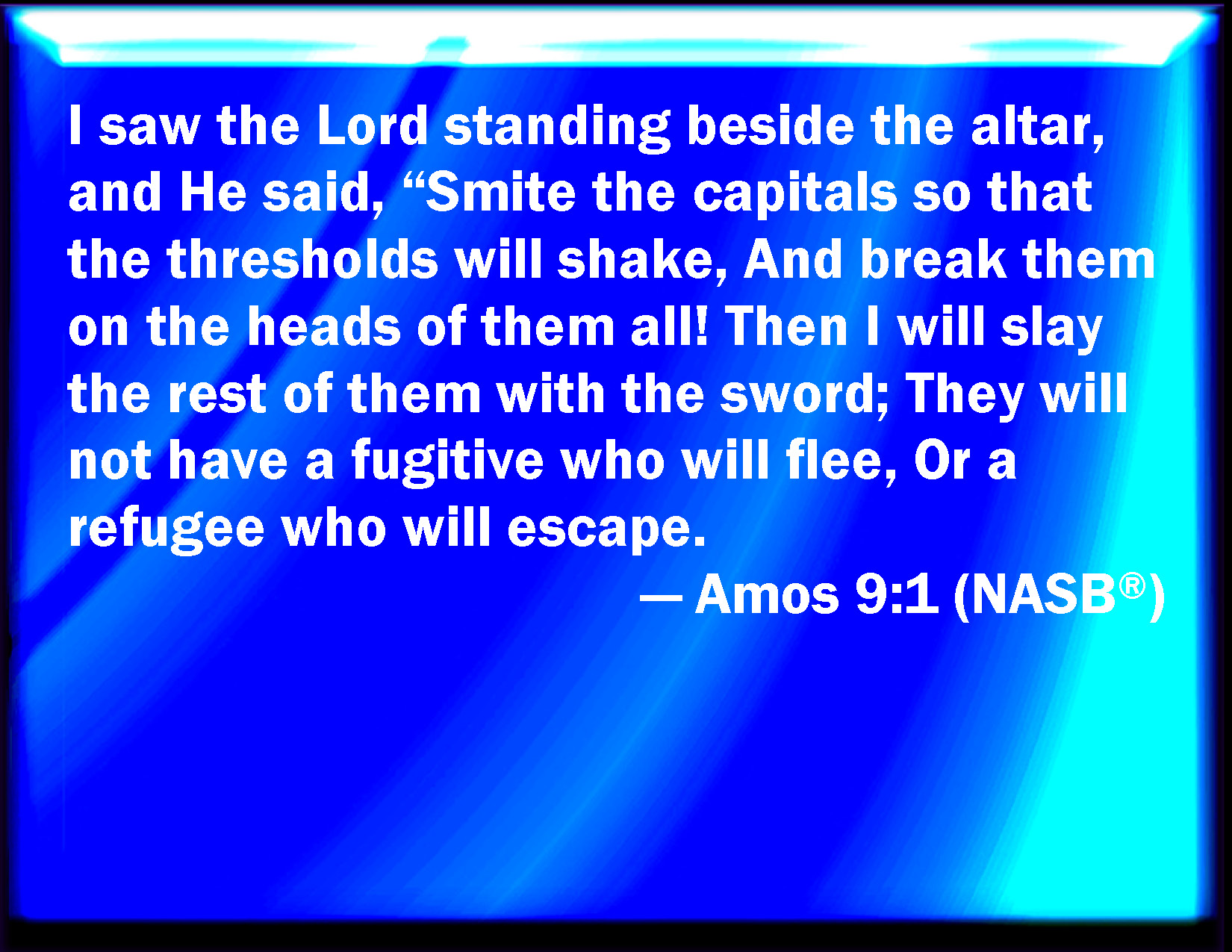 Bible Verse Slide Amos 9:1 I saw the LORD standing on the altar: and he said, Smite the lintel of the door, that the posts may shake: and cut them in the head, all of them; and I will slay the last of them with the sword: he that flees of them shall not flee away, and he that escapes of them shall not be delivered. KJV: I saw the Lord standing upon the altar: and he said, Smite the lintel of the door, that the posts may shake: and cut them in the head, all of them; and I will slay the last of them with the sword: he that fleeth of them shall not flee away, and he that escapeth of them shall not be delivered. DRB: I saw the Lord standing upon the altar, and he said: Strike the hinges, and let the lintels be shook: for there is covetousness in the head of them all, and I will slay the last of them with the sword: there shall be no flight for them: they shall flee, and he that shall flee of them shall not be delivered. DBT: I saw the Lord standing upon the altar; and he said, Smite the chapiter that the thresholds may shake; and break all of them in pieces, in the head; and I will slay the last of them with the sword: he that fleeth of them shall not get away by flight, and he that escapeth of them shall not be delivered. ERV: I SAW the Lord standing beside the altar: and he said, Smite the chapiters, that the thresholds may shake: and break them in pieces on the head of all of them; and I will slay the last of them with the sword: there shall not one of them flee away, and there shall not one of them escape. WBT: I saw the Lord standing upon the altar: and he said, Smite the lintel of the door, that the posts may shake: and cut them in the head, all of them; and I will slay the last of them with the sword: he that fleeth of them shall not flee away, and he that escapeth of them shall not be delivered. WEB: I saw the Lord standing beside the altar, and he said, "Strike the tops of the pillars, that the thresholds may shake; and break them in pieces on the head of all of them; and I will kill the last of them with the sword: there shall not one of them flee away, and there shall not one of them escape. YLT: I have seen the Lord standing by the altar, and He saith: 'Smite the knob, and the thresholds shake, And cut them off by the head — all of them, And their posterity with a sword I do slay, Not flee to them doth the fleer, Nor escape to them doth a fugitive.Links Amos 9:1 NIV • Amos 9:1 NLT • Amos 9:1 ESV • Amos 9:1 NASB • Amos 9:1 KJV • Amos 9:1 Interlinear • Amos 9:1 Commentaries • Amos 9:1 Parallel Texts • Amos 9:1 Bible Apps • Amos 9:1 Parallel • Bible Hub |