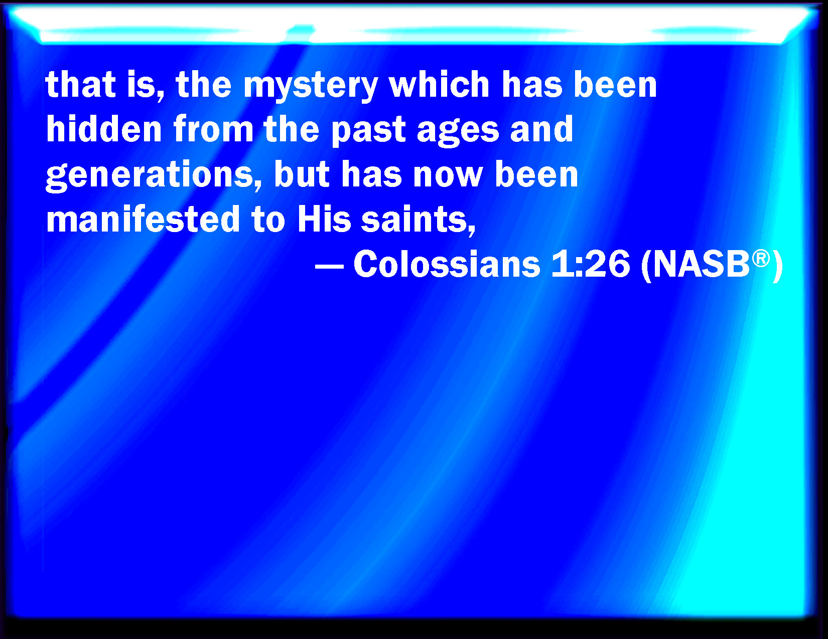 Bible Verse Slide Colossians 1:26 Even the mystery which has been hid from ages and from generations, but now is made manifest to his saints: KJV: Even the mystery which hath been hid from ages and from generations, but now is made manifest to his saints: DRB: The mystery which hath been hidden from ages and generations, but now is manifested to his saints, DBT: the mystery which has been hidden from ages and from generations, but has now been made manifest to his saints; ERV: even the mystery which hath been hid from all ages and generations: but now hath it been manifested to his saints, WBT: Even the mystery which hath been hid from ages, and from generations, but now is made manifest to his saints: WEB: the mystery which has been hidden for ages and generations. But now it has been revealed to his saints, YLT: the secret that hath been hid from the ages and from the generations, but now was manifested to his saints,Links Colossians 1:26 NIV • Colossians 1:26 NLT • Colossians 1:26 ESV • Colossians 1:26 NASB • Colossians 1:26 KJV • Colossians 1:26 Interlinear • Colossians 1:26 Commentaries • Colossians 1:26 Parallel Texts • Colossians 1:26 Bible Apps • Colossians 1:26 Parallel • Bible Hub |