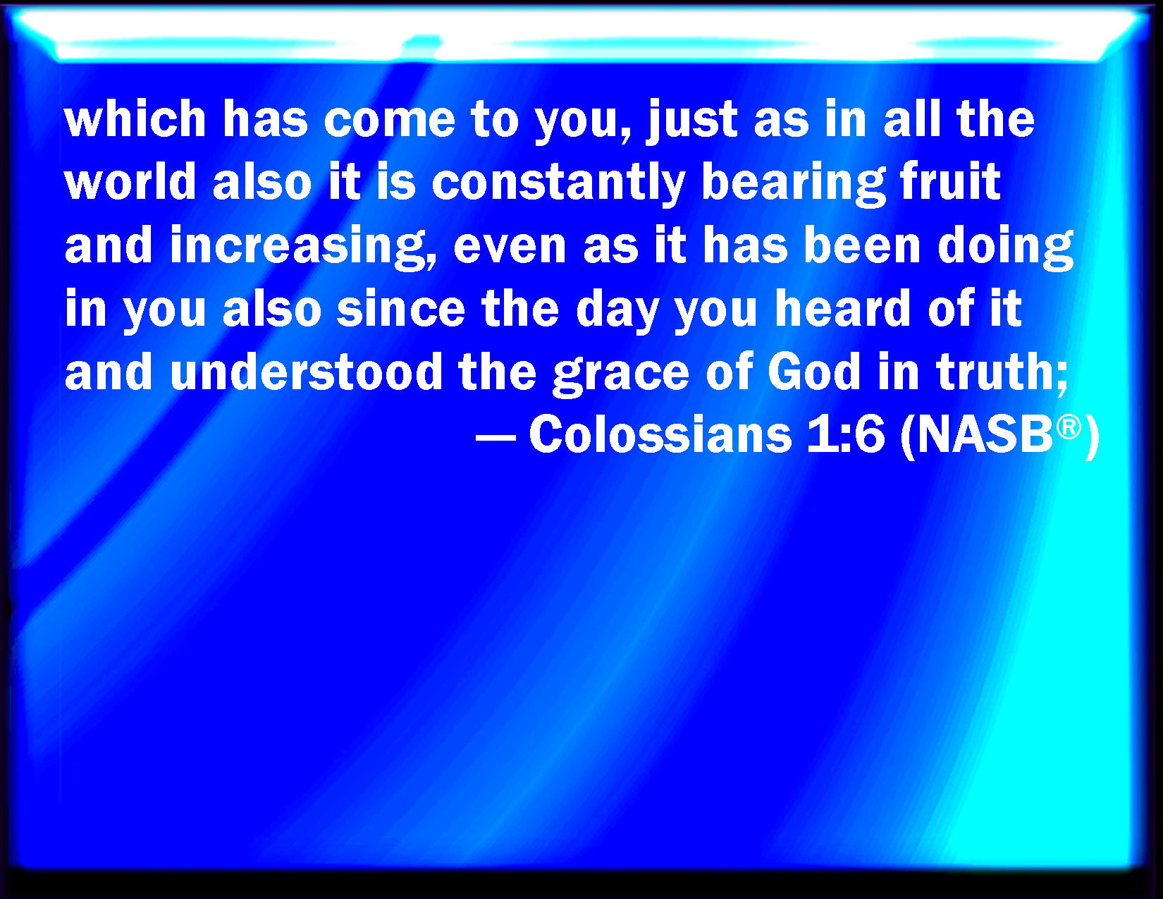 Bible Verse Slide Colossians 1:6 Which is come to you, as it is in all the world; and brings forth fruit, as it does also in you, since the day you heard of it, and knew the grace of God in truth: KJV: Which is come unto you, as it is in all the world; and bringeth forth fruit, as it doth also in you, since the day ye heard of it, and knew the grace of God in truth: DRB: Which is come unto you, as also it is in the whole world, and bringeth forth fruit and groweth, even as it doth in you, since the day you heard and knew the grace of God in truth. DBT: which are come to you, as they are in all the world, and are bearing fruit and growing, even as also among you, from the day ye heard them and knew indeed the grace of God, in truth: ERV: which is come unto you; even as it is also in all the world bearing fruit and increasing, as it doth in you also, since the day ye heard and knew the grace of God in truth; WBT: Which is come to you, as it is in all the world; and bringeth forth fruit, as it doth also in you, since the day ye heard of it, and knew the grace of God in truth: WEB: which has come to you; even as it is in all the world and is bearing fruit and growing, as it does in you also, since the day you heard and knew the grace of God in truth; YLT: which is present to you, as also in all the world, and is bearing fruit, as also in you, from the day in which ye heard, and knew the grace of God in truth;Links Colossians 1:6 NIV • Colossians 1:6 NLT • Colossians 1:6 ESV • Colossians 1:6 NASB • Colossians 1:6 KJV • Colossians 1:6 Interlinear • Colossians 1:6 Commentaries • Colossians 1:6 Parallel Texts • Colossians 1:6 Bible Apps • Colossians 1:6 Parallel • Bible Hub |