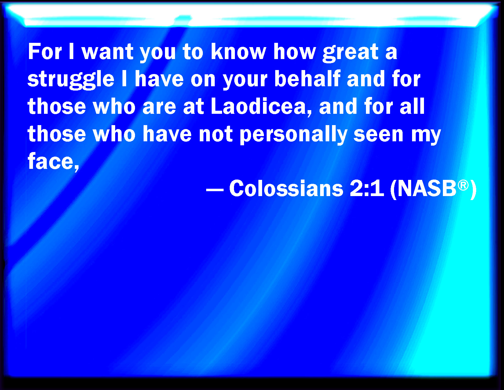 Bible Verse Slide Colossians 2:1 For I would that you knew what great conflict I have for you, and for them at Laodicea, and for as many as have not seen my face in the flesh; KJV: For I would that ye knew what great conflict I have for you, and for them at Laodicea, and for as many as have not seen my face in the flesh; DRB: For I would have you know, what manner of care I have for you and for them that are at Laodicea, and whosoever have not seen my face in the flesh: DBT: For I would have you know what combat I have for you, and those in Laodicea, and as many as have not seen my face in flesh; ERV: For I would have you know how greatly I strive for you, and for them at Laodicea, and for as many as have not seen my face in the flesh; WBT: For I would that ye knew what great conflict I have for you, and for them at Laodicea, and for as many as have not seen my face in the flesh; WEB: For I desire to have you know how greatly I struggle for you, and for those at Laodicea, and for as many as have not seen my face in the flesh; YLT: For I wish you to know how great a conflict I have for you and those in Laodicea, and as many as have not seen my face in the flesh,Links Colossians 2:1 NIV • Colossians 2:1 NLT • Colossians 2:1 ESV • Colossians 2:1 NASB • Colossians 2:1 KJV • Colossians 2:1 Interlinear • Colossians 2:1 Commentaries • Colossians 2:1 Parallel Texts • Colossians 2:1 Bible Apps • Colossians 2:1 Parallel • Bible Hub |