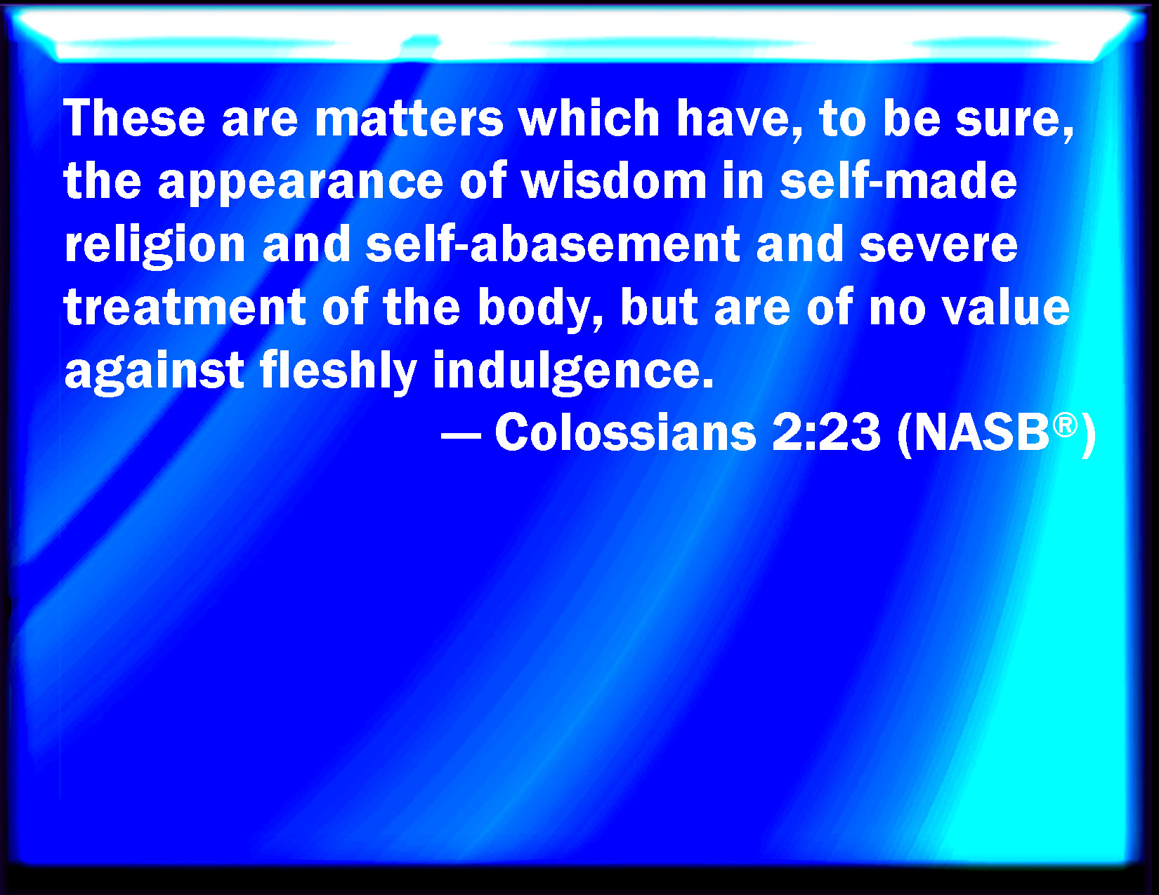Bible Verse Slide Colossians 2:23 Which things have indeed a show of wisdom in will worship, and humility, and neglecting of the body: not in any honor to the satisfying of the flesh. KJV: Which things have indeed a shew of wisdom in will worship, and humility, and neglecting of the body; not in any honour to the satisfying of the flesh. DRB: Which things have indeed a shew of wisdom in superstition and humility, and not sparing the body; not in any honour to the filling of the flesh. DBT: (which have indeed an appearance of wisdom in voluntary worship, and humility, and harsh treatment of the body, not in a certain honour,) to the satisfaction of the flesh. ERV: Which things have indeed a show of wisdom in will-worship, and humility, and severity to the body; but are not of any value against the indulgence of the flesh. WBT: Which things have indeed a show of wisdom in will-worship, and humility, and neglecting of the body; not in any honor to the satisfying of the flesh. WEB: Which things indeed appear like wisdom in self-imposed worship, and humility, and severity to the body; but aren't of any value against the indulgence of the flesh. YLT: which are, indeed, having a matter of wisdom in will-worship, and humble-mindedness, and neglecting of body — not in any honour, unto a satisfying of the flesh.Links Colossians 2:23 NIV • Colossians 2:23 NLT • Colossians 2:23 ESV • Colossians 2:23 NASB • Colossians 2:23 KJV • Colossians 2:23 Interlinear • Colossians 2:23 Commentaries • Colossians 2:23 Parallel Texts • Colossians 2:23 Bible Apps • Colossians 2:23 Parallel • Bible Hub |