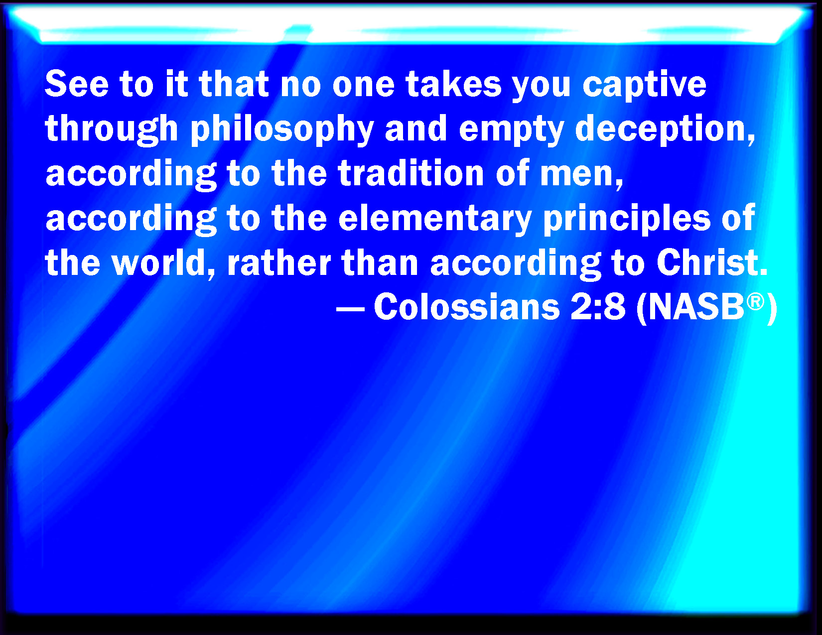 Bible Verse Slide Colossians 2:8 Beware lest any man spoil you through philosophy and vain deceit, after the tradition of men, after the rudiments of the world, and not after Christ. KJV: Beware lest any man spoil you through philosophy and vain deceit, after the tradition of men, after the rudiments of the world, and not after Christ. DRB: Beware lest any man cheat you by philosophy, and vain deceit; according to the tradition of men, according to the elements of the world, and not according to Christ: DBT: See that there be no one who shall lead you away as a prey through philosophy and vain deceit, according to the teaching of men, according to the elements of the world, and not according to Christ. ERV: Take heed lest there shall be any one that maketh spoil of you through his philosophy and vain deceit, after the tradition of men, after the rudiments of the world, and not after Christ: WBT: Beware lest any man make a prey of you through philosophy and vain deceit, after the tradition of men, after the rudiments of the world, and not after Christ. WEB: Be careful that you don't let anyone rob you through his philosophy and vain deceit, after the tradition of men, after the elements of the world, and not after Christ. YLT: See that no one shall be carrying you away as spoil through the philosophy and vain deceit, according to the deliverance of men, according to the rudiments of the world, and not according to Christ,Links Colossians 2:8 NIV • Colossians 2:8 NLT • Colossians 2:8 ESV • Colossians 2:8 NASB • Colossians 2:8 KJV • Colossians 2:8 Interlinear • Colossians 2:8 Commentaries • Colossians 2:8 Parallel Texts • Colossians 2:8 Bible Apps • Colossians 2:8 Parallel • Bible Hub |