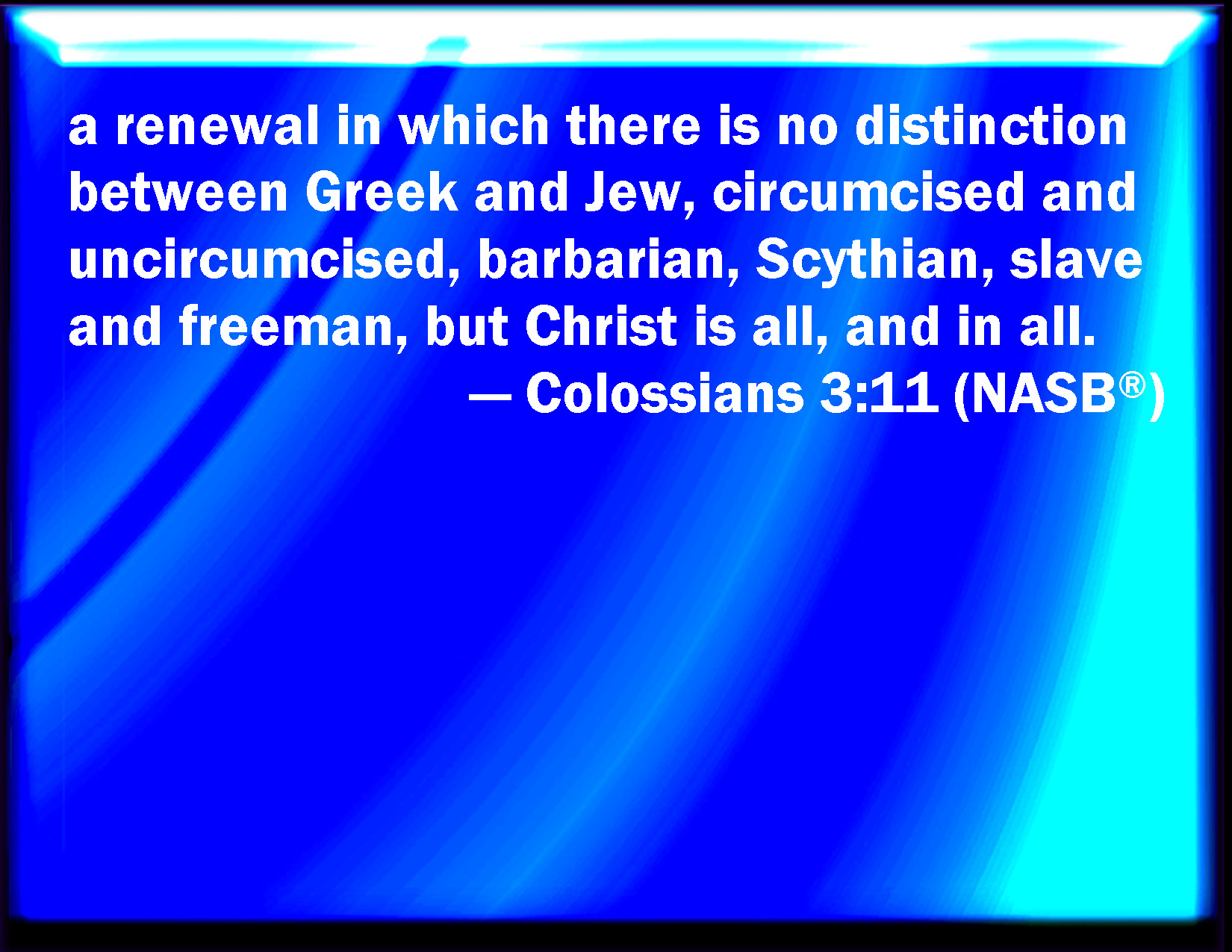 Bible Verse Slide Colossians 3:11 Where there is neither Greek nor Jew, circumcision nor uncircumcision, Barbarian, Scythian, bond nor free: but Christ is all, and in all. KJV: Where there is neither Greek nor Jew, circumcision nor uncircumcision, Barbarian, Scythian, bond nor free: but Christ is all, and in all. DRB: Where there is neither Gentile nor Jew, circumcision nor uncircumcision, Barbarian nor Scythian, bond nor free. But Christ is all, and in all. DBT: wherein there is not Greek and Jew, circumcision and uncircumcision, barbarian, Scythian, bondman, freeman; but Christ is everything, and in all. ERV: where there cannot be Greek and Jew, circumcision and uncircumcision, barbarian, Scythian, bondman, freeman: but Christ is all, and in all. WBT: Where there is neither Greek nor Jew, circumcision nor uncircumcision, Barbarian, Scythian, bond nor free: but Christ is all, and in all. WEB: where there can't be Greek and Jew, circumcision and uncircumcision, barbarian, Scythian, bondservant, freeman; but Christ is all, and in all. YLT: where there is not Greek and Jew, circumcision and uncircumcision, foreigner, Scythian, servant, freeman — but the all and in all — Christ.Links Colossians 3:11 NIV • Colossians 3:11 NLT • Colossians 3:11 ESV • Colossians 3:11 NASB • Colossians 3:11 KJV • Colossians 3:11 Interlinear • Colossians 3:11 Commentaries • Colossians 3:11 Parallel Texts • Colossians 3:11 Bible Apps • Colossians 3:11 Parallel • Bible Hub |