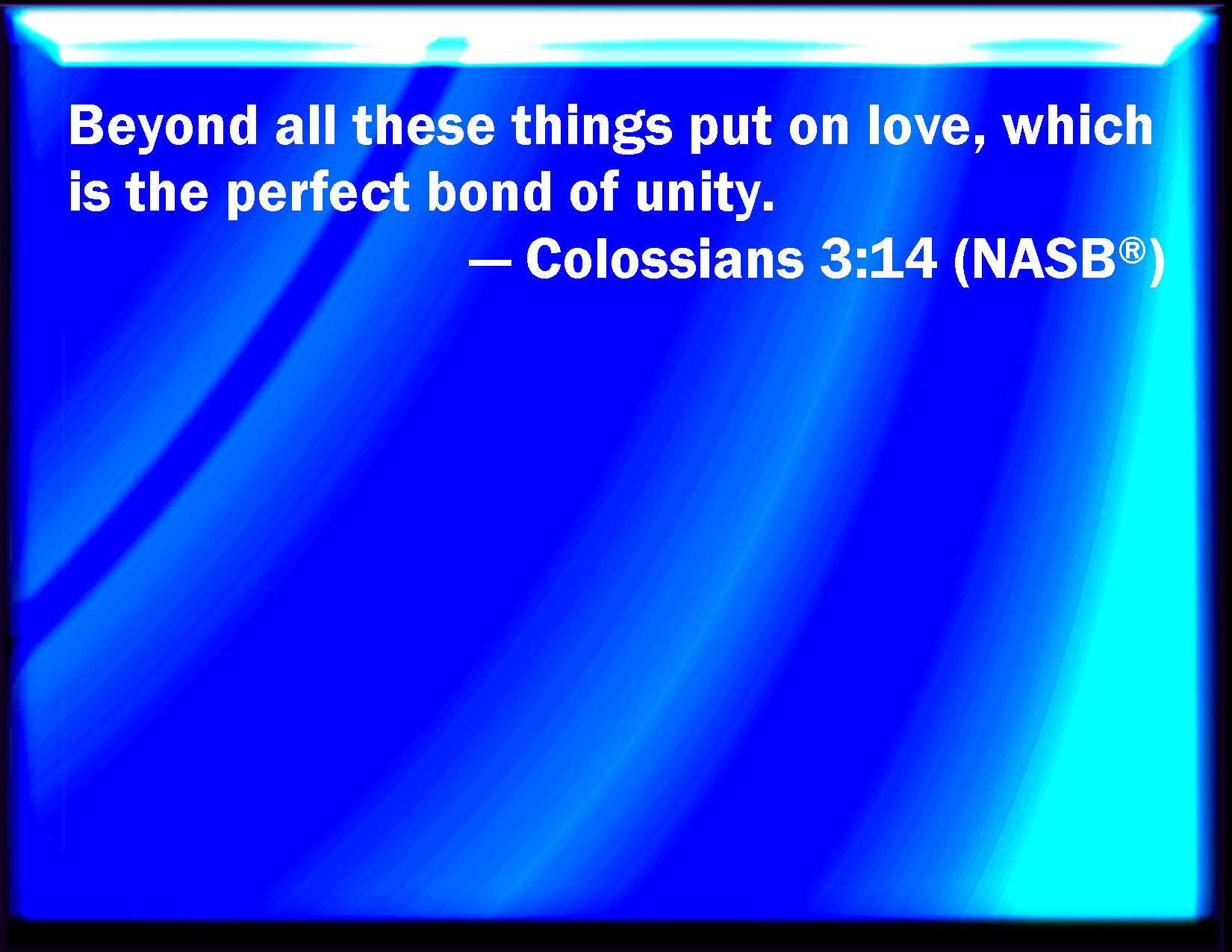 Bible Verse Slide Colossians 3:14 And above all these things put on charity, which is the bond of perfection. KJV: And above all these things put on charity, which is the bond of perfectness. DRB: But above all these things have charity, which is the bond of perfection: DBT: And to all these add love, which is the bond of perfectness. ERV: and above all these things put on love, which is the bond of perfectness. WBT: And above all these things put on charity, which is the bond of perfectness. WEB: Above all these things, walk in love, which is the bond of perfection. YLT: and above all these things, have love, which is a bond of the perfection,Links Colossians 3:14 NIV • Colossians 3:14 NLT • Colossians 3:14 ESV • Colossians 3:14 NASB • Colossians 3:14 KJV • Colossians 3:14 Interlinear • Colossians 3:14 Commentaries • Colossians 3:14 Parallel Texts • Colossians 3:14 Bible Apps • Colossians 3:14 Parallel • Bible Hub |