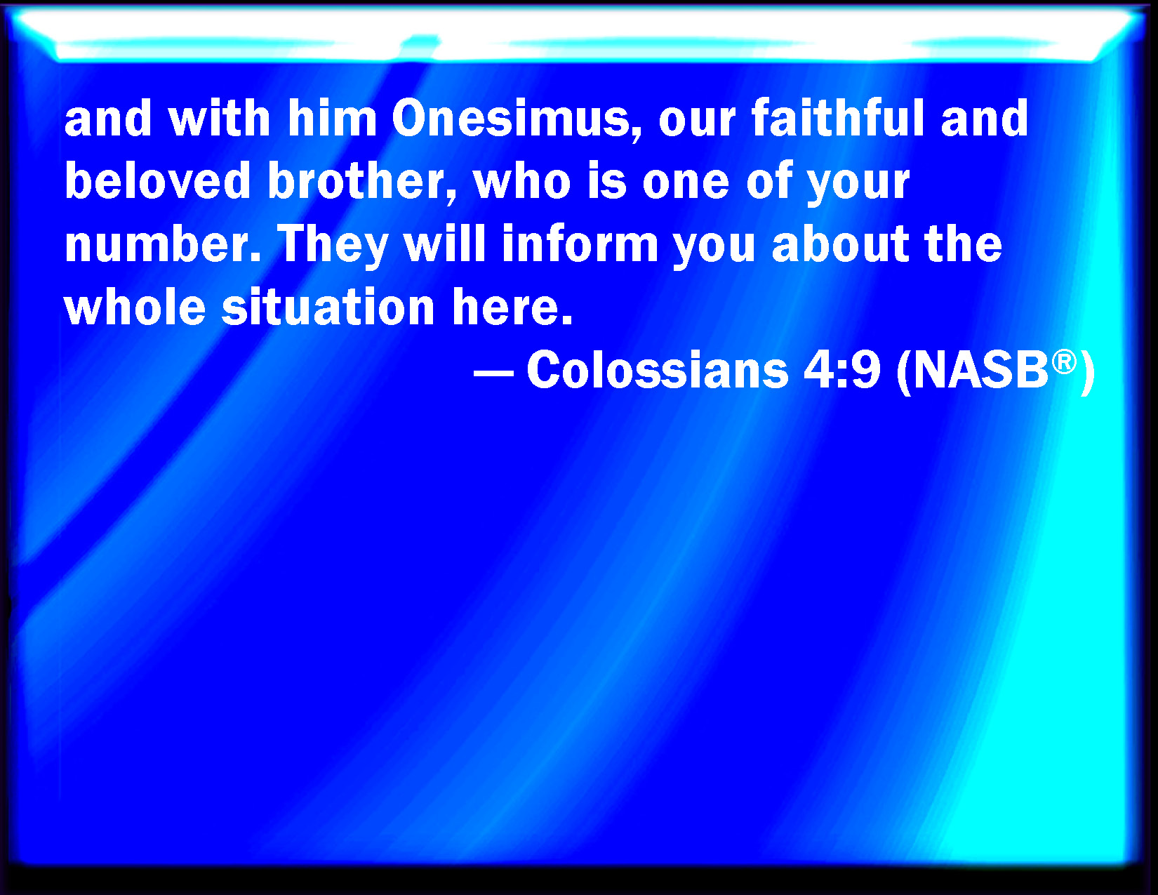 Bible Verse Slide Colossians 4:9 With Onesimus, a faithful and beloved brother, who is one of you. They shall make known to you all things which are done here. KJV: With Onesimus, a faithful and beloved brother, who is one of you. They shall make known unto you all things which are done here. DRB: With Onesimus, a most beloved and faithful brother, who is one of you. All things that are done here, they shall make known to you. DBT: with Onesimus, the faithful and beloved brother, who is one of you. They shall make known to you everything here. ERV: together with Onesimus, the faithful and beloved brother, who is one of you. They shall make known unto you all things that are done here. WBT: With Onesimus, a faithful and beloved brother, who is one of you. They will make known to you all things which are done here. WEB: together with Onesimus, the faithful and beloved brother, who is one of you. They will make known to you everything that is going on here. YLT: with Onesimus the faithful and beloved brother, who is of you; all things to you shall they make known that are here.Links Colossians 4:9 NIV • Colossians 4:9 NLT • Colossians 4:9 ESV • Colossians 4:9 NASB • Colossians 4:9 KJV • Colossians 4:9 Interlinear • Colossians 4:9 Commentaries • Colossians 4:9 Parallel Texts • Colossians 4:9 Bible Apps • Colossians 4:9 Parallel • Bible Hub |