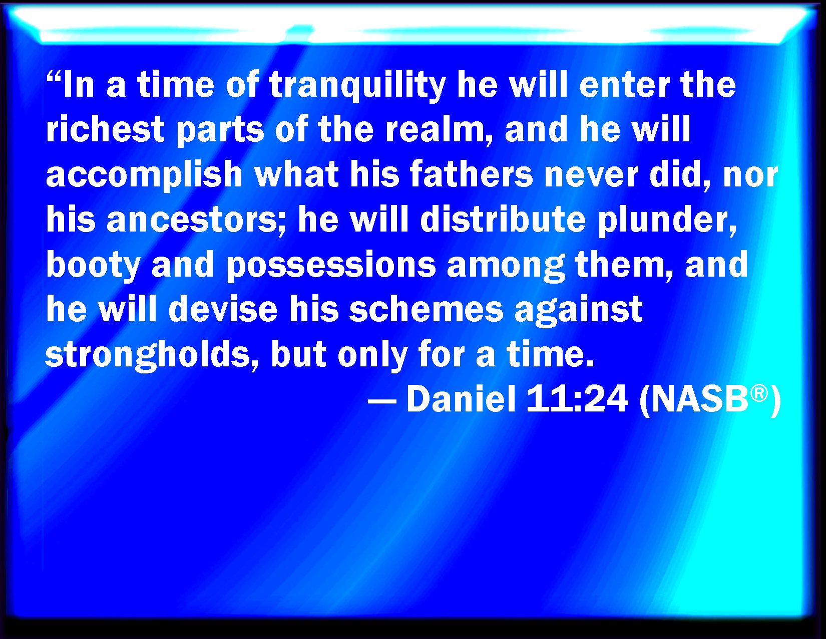 Bible Verse Slide Daniel 11:24 He shall enter peaceably even on the fattest places of the province; and he shall do that which his fathers have not done, nor his fathers' fathers; he shall scatter among them the prey, and spoil, and riches: yes, and he shall forecast his devices against the strong holds, even for a time. KJV: He shall enter peaceably even upon the fattest places of the province; and he shall do that which his fathers have not done, nor his fathers' fathers; he shall scatter among them the prey, and spoil, and riches: yea, and he shall forecast his devices against the strong holds, even for a time. DRB: And he shall enter into rich and plentiful cities: and he shall do that which his fathers never did, nor his fathers' fathers: he shall scatter their spoils, and their prey, and their riches, and shall forecast devices against the best fenced places: and this until a time. DBT: In time of peace shall he enter even into the fattest places of the province; and he shall do that which his fathers have not done, nor his fathers' fathers: he shall scatter among them prey, and spoil, and substance, and he shall plan his devices against the fortified places, even for a time. ERV: In time of security shall he come even upon the fattest places of the province; and he shall do that which his fathers have not done, nor his fathers' fathers; he shall scatter among them prey, and spoil, and substance: yea, he shall devise his devices against the strong holds, even for a time. WBT: He shall enter peaceably even upon the fattest places of the province; and he shall do that which his fathers have not done, nor his fathers' fathers; he shall scatter among them the prey, and spoil, and riches: yes, and he shall forecast his devices against the strong holds, even for a time. WEB: In time of security shall he come even on the fattest places of the province; and he shall do that which his fathers have not done, nor his fathers' fathers; he shall scatter among them prey, and spoil, and substance: yes, he shall devise his devices against the strongholds, even for a time. YLT: Peaceably even into the fertile places of the province He cometh, and he hath done that which his fathers did not, nor his fathers' fathers; prey, and spoil, and substance, to them he scattereth, and against fenced places he deviseth his devices, even for a time.Links Daniel 11:24 NIV • Daniel 11:24 NLT • Daniel 11:24 ESV • Daniel 11:24 NASB • Daniel 11:24 KJV • Daniel 11:24 Interlinear • Daniel 11:24 Commentaries • Daniel 11:24 Parallel Texts • Daniel 11:24 Bible Apps • Daniel 11:24 Parallel • Bible Hub |
