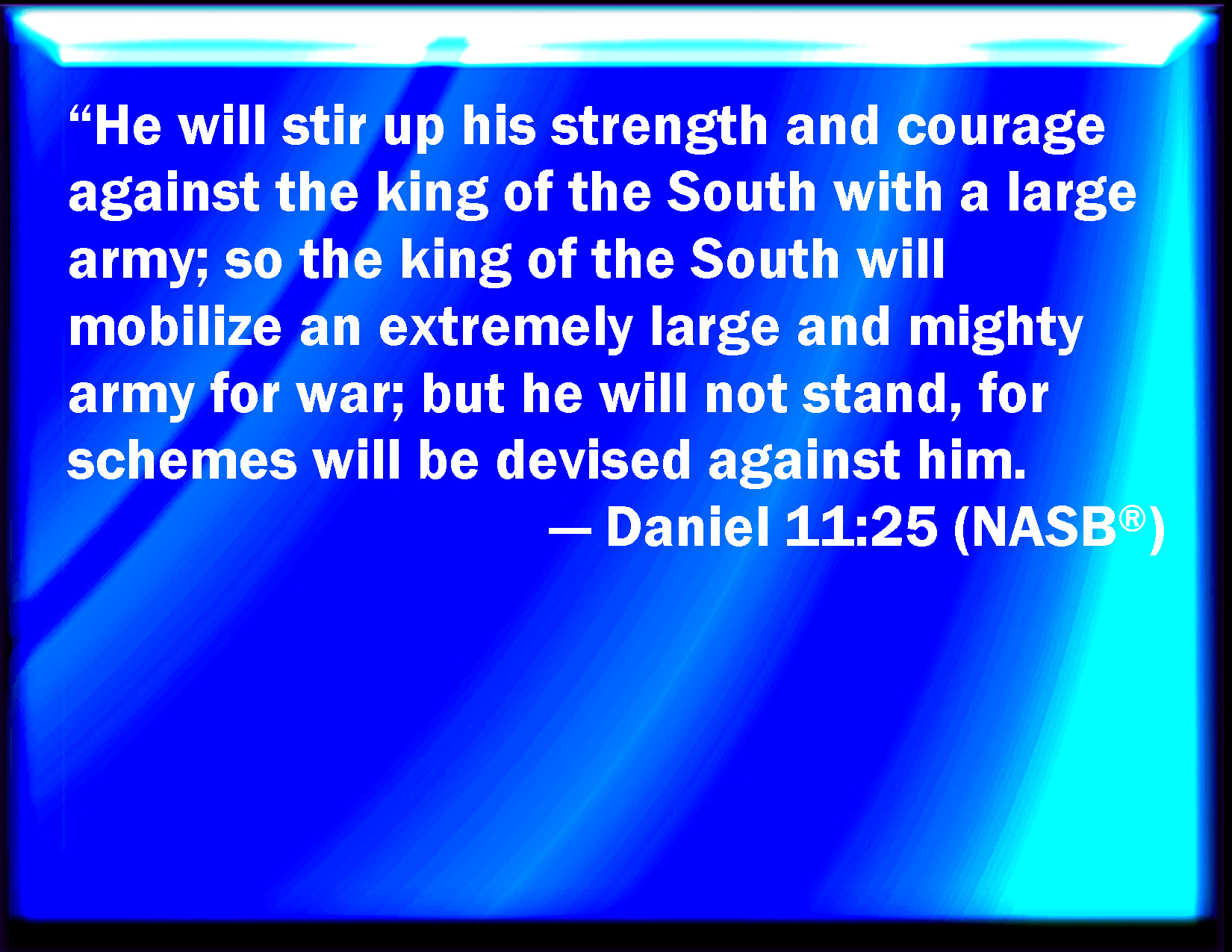 Daniel 11:25 And he shall stir up his power and his courage against the king of the south with a great army; and the king of the south shall be stirred up to battle with a very great and mighty army; but he shall not stand: for they shall forecast devices against him.