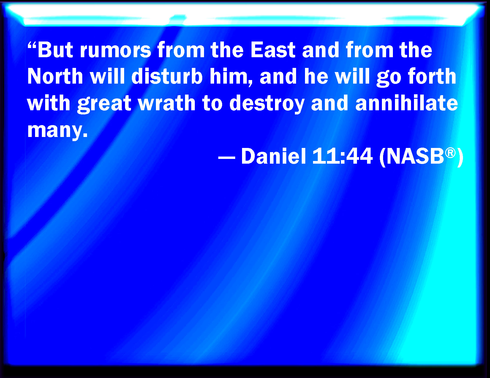 Daniel 11:44 But tidings out of the east and out of the north shall trouble him: therefore he shall go forth with great fury to destroy, and utterly to make away many.