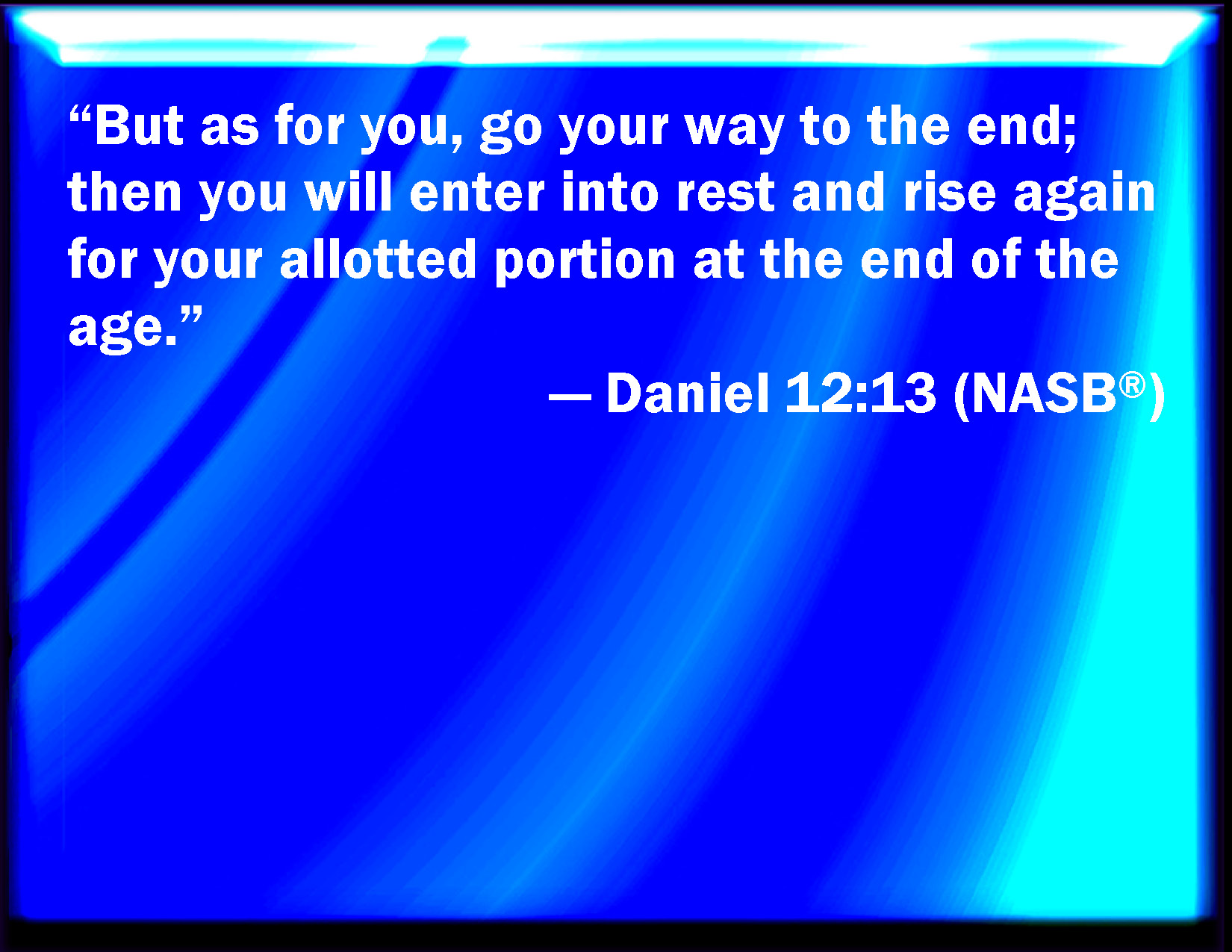 Bible Verse Slide Daniel 12:13 But go you your way till the end be: for you shall rest, and stand in your lot at the end of the days. KJV: But go thou thy way till the end be: for thou shalt rest, and stand in thy lot at the end of the days. DRB: But go thou thy ways until the time appointed: and thou shalt rest, and stand in thy lot unto the end of the days. DBT: But do thou go thy way until the end; and thou shalt rest, and stand in thy lot at the end of the days. ERV: But go thou thy way till the end be: for thou shalt rest, and shalt stand in thy lot, at the end of the days. WBT: But go thou thy way till the end: for thou shalt rest, and stand in thy lot at the end of the days. WEB: But go you your way until the end; for you shall rest, and shall stand in your lot, at the end of the days. YLT: And thou, go on to the end, then thou dost rest, and dost stand in thy lot at the end of the days.'Links Daniel 12:13 NIV • Daniel 12:13 NLT • Daniel 12:13 ESV • Daniel 12:13 NASB • Daniel 12:13 KJV • Daniel 12:13 Interlinear • Daniel 12:13 Commentaries • Daniel 12:13 Parallel Texts • Daniel 12:13 Bible Apps • Daniel 12:13 Parallel • Bible Hub |