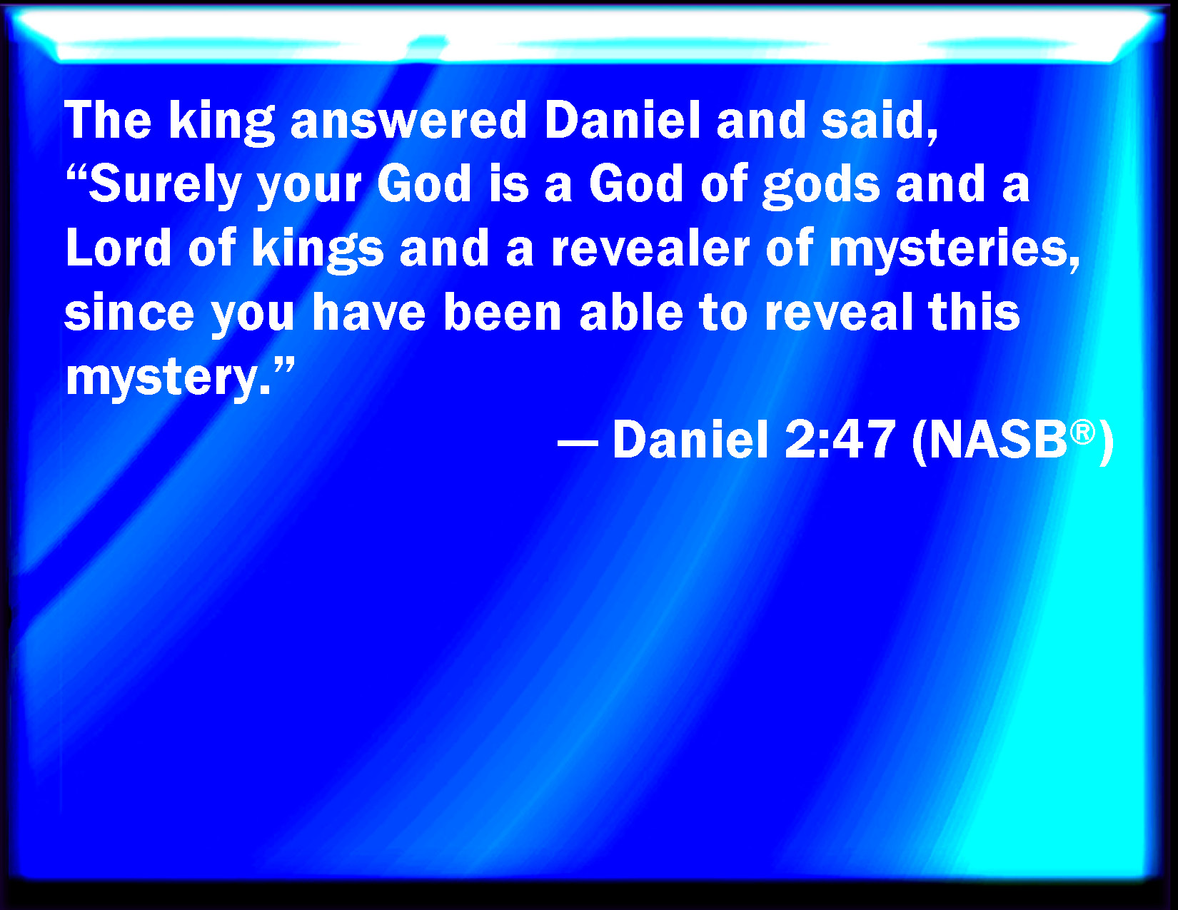 Bible Verse Slide Daniel 2:47 The king answered to Daniel, and said, Of a truth it is, that your God is a God of gods, and a Lord of kings, and a revealer of secrets, seeing you could reveal this secret. KJV: The king answered unto Daniel, and said, Of a truth it is, that your God is a God of gods, and a Lord of kings, and a revealer of secrets, seeing thou couldest reveal this secret. DRB: And the king spoke to Daniel, and said: Verily your God is the God of gods, and Lord of kings, and a revealer of hidden things: seeing thou couldst discover this secret. DBT: The king answered Daniel and said, Of a truth it is that your God is the God of gods, and the Lord of kings, and a revealer of secrets, because thou wast able to reveal this secret. ERV: The king answered unto Daniel, and said, Of a truth your God is the God of gods, and the Lord of kings, and a revealer of secrets, sing thou hast been able to reveal this secret. WBT: The king answered to Daniel, and said, Of a truth it is, that your God is a God of gods, and a Lord of kings, and a revealer of secrets, seeing thou couldst reveal this secret. WEB: The king answered to Daniel, and said, Of a truth your God is the God of gods, and the Lord of kings, and a revealer of secrets, since you have been able to reveal this secret. YLT: The king hath answered Daniel and said, 'Of a truth it is that your God is a God of gods, and a Lord of kings, and a revealer of secrets, since thou hast been able to reveal this secret.'Links Daniel 2:47 NIV • Daniel 2:47 NLT • Daniel 2:47 ESV • Daniel 2:47 NASB • Daniel 2:47 KJV • Daniel 2:47 Interlinear • Daniel 2:47 Commentaries • Daniel 2:47 Parallel Texts • Daniel 2:47 Bible Apps • Daniel 2:47 Parallel • Bible Hub |