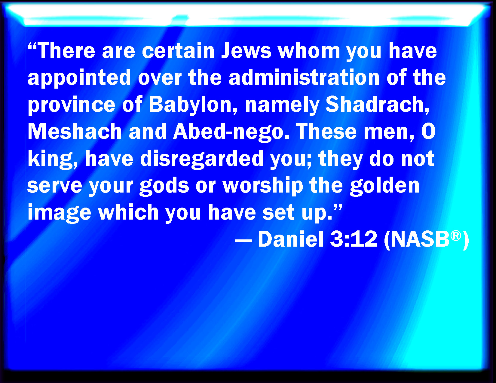 Bible Verse Slide Daniel 3:12 There are certain Jews whom you have set over the affairs of the province of Babylon, Shadrach, Meshach, and Abednego; these men, O king, have not regarded you: they serve not your gods, nor worship the golden image which you have set up. KJV: There are certain Jews whom thou hast set over the affairs of the province of Babylon, Shadrach, Meshach, and Abednego; these men, O king, have not regarded thee: they serve not thy gods, nor worship the golden image which thou hast set up. DRB: Now there are certain Jews whom thou hast set over the works of the province of Babylon, Sidrach, Misach, and Abdenago: these men, O king, have slighted thy decree: they worship not thy gods, nor do they adore the golden statue which thou hast set up. DBT: There are certain Jews whom thou hast appointed over the administration of the province of Babylon: Shadrach, Meshach, and Abed-nego: these men, O king, regard thee not; they serve not thy gods, nor worship the golden image that thou hast set up. ERV: There are certain Jews whom thou hast appointed over the affairs of the province of Babylon, Shadrach, Meshach, and Abed-nego; these men, O king, have not regarded thee: they serve not thy gods, nor worship the golden image which thou hast set up. WBT: There are certain Jews whom thou hast set over the affairs of the province of Babylon, Shadrach, Meshach, and Abed-nego; these men, O king, have not regarded thee: they serve not thy gods, nor worship the golden image which thou hast set up. WEB: There are certain Jews whom you have appointed over the affairs of the province of Babylon: Shadrach, Meshach, and Abednego; these men, O king, have not respected you. They don't serve your gods, nor worship the golden image which you have set up. YLT: There are certain Jews whom thou hast appointed over the work of the province of Babylon — Shadrach, Meshach, and Abed-Nego, these men have not made of thee, O king, any regard; thy gods they are not serving, and to the golden image thou hast raised up — are not making obeisance.'Links Daniel 3:12 NIV • Daniel 3:12 NLT • Daniel 3:12 ESV • Daniel 3:12 NASB • Daniel 3:12 KJV • Daniel 3:12 Interlinear • Daniel 3:12 Commentaries • Daniel 3:12 Parallel Texts • Daniel 3:12 Bible Apps • Daniel 3:12 Parallel • Bible Hub |