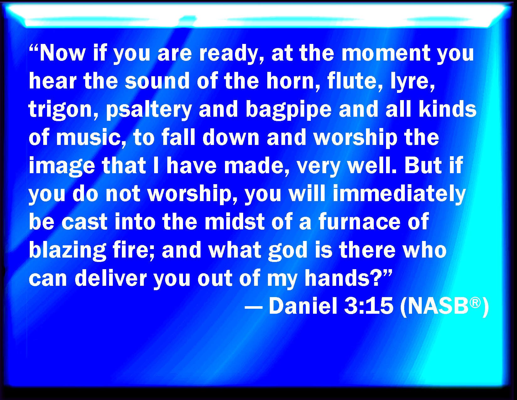 Bible Verse Slide Daniel 3:15 Now if you be ready that at what time you hear the sound of the cornet, flute, harp, sackbut, psaltery, and dulcimer, and all kinds of music, you fall down and worship the image which I have made; well: but if you worship not, you shall be cast the same hour into the middle of a burning fiery furnace; and who is that God that shall deliver you out of my hands? KJV: Now if ye be ready that at what time ye hear the sound of the cornet, flute, harp, sackbut, psaltery, and dulcimer, and all kinds of musick, ye fall down and worship the image which I have made; well: but if ye worship not, ye shall be cast the same hour into the midst of a burning fiery furnace; and who is that God that shall deliver you out of my hands? DRB: Now therefore if you be ready at what hour soever you shall hear the sound of the trumpet, flute, harp, sackbut, and psaltery, and symphony, and of all kind of music, prostrate yourselves, and adore the statue which I have made: but if you do not adore, you shall be cast the same hour into the furnace of burning fire: and who is the God that shall deliver you out of my hand? DBT: Now if ye be ready at the time that ye hear the sound of the cornet, pipe, lute, sambuca, psaltery, and bagpipe, and all kinds of music, to fall down and worship the image that I have made, well: but if ye worship not, ye shall be cast that same hour into the midst of a burning fiery furnace: and who is the God that shall deliver you out of my hands? ERV: Now if ye be ready that at what time ye hear the sound of the cornet, flute, harp, sackbut, psaltery, and dulcimer, and all kinds of music, ye fall down and worship the image which I have made, well: but if ye worship not, ye shall be cast the same hour into the midst of a burning fiery furnace; and who is that God that shall deliver you out of my hands? WBT: Now if ye be ready that at what time ye hear the sound of the cornet, flute, harp, sackbut, psaltery, and dulcimer, and all kinds of music, ye fall down and worship the image which I have made; well: but if ye worship not, ye shall be cast the same hour into the midst of a burning fiery furnace; and who is that God that shall deliver you out of my hands? WEB: Now if you are ready whenever you hear the sound of the horn, flute, zither, lyre, harp, pipe, and all kinds of music to fall down and worship the image which I have made, [well]: but if you don't worship, you shall be cast the same hour into the midst of a burning fiery furnace; and who is that god that shall deliver you out of my hands? YLT: Now, lo, ye are ready, so that at the time that ye hear the voice of the cornet, the flute, the harp, the sackbut, the psaltery, and the symphony, and all kinds of music, ye fall down and do obeisance to the image that I have made! — and lo, ye do no obeisance — in that hour ye are cast into the midst of a burning fiery furnace; who is that God who doth deliver you out of my hands?'Links Daniel 3:15 NIV • Daniel 3:15 NLT • Daniel 3:15 ESV • Daniel 3:15 NASB • Daniel 3:15 KJV • Daniel 3:15 Interlinear • Daniel 3:15 Commentaries • Daniel 3:15 Parallel Texts • Daniel 3:15 Bible Apps • Daniel 3:15 Parallel • Bible Hub |