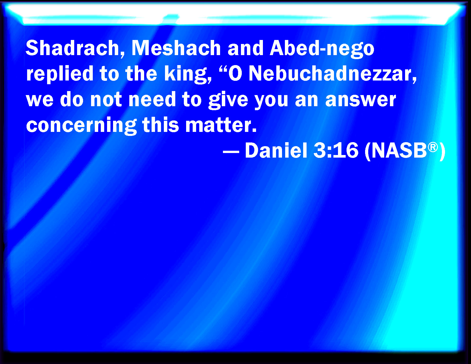 Bible Verse Slide Daniel 3:16 Shadrach, Meshach, and Abednego, answered and said to the king, O Nebuchadnezzar, we are not careful to answer you in this matter. KJV: Shadrach, Meshach, and Abednego, answered and said to the king, O Nebuchadnezzar, we are not careful to answer thee in this matter. DRB: Sidrach, Misach, and Abdenago answered and said to king Nabuchodonosor: We have no occasion to answer thee concerning this matter. DBT: Shadrach, Meshach, and Abed-nego answered and said to the king, O Nebuchadnezzar, we have no need to answer thee in this matter. ERV: Shadrach, Meshach, and Abed-nego, answered and said to the king, O Nebuchadnezzar, we have no need to answer thee in this matter. WBT: Shadrach, Meshach, and Abed-nego, answered and said to the king, O Nebuchadnezzar, we are not careful to answer thee in this matter. WEB: Shadrach, Meshach, and Abednego answered the king, Nebuchadnezzar, we have no need to answer you in this matter. YLT: Shadrach, Meshach, and Abed-Nego have answered, yea, they are saying to the king Nebuchadnezzar, 'We have no need concerning this matter to answer thee.Links Daniel 3:16 NIV • Daniel 3:16 NLT • Daniel 3:16 ESV • Daniel 3:16 NASB • Daniel 3:16 KJV • Daniel 3:16 Interlinear • Daniel 3:16 Commentaries • Daniel 3:16 Parallel Texts • Daniel 3:16 Bible Apps • Daniel 3:16 Parallel • Bible Hub |