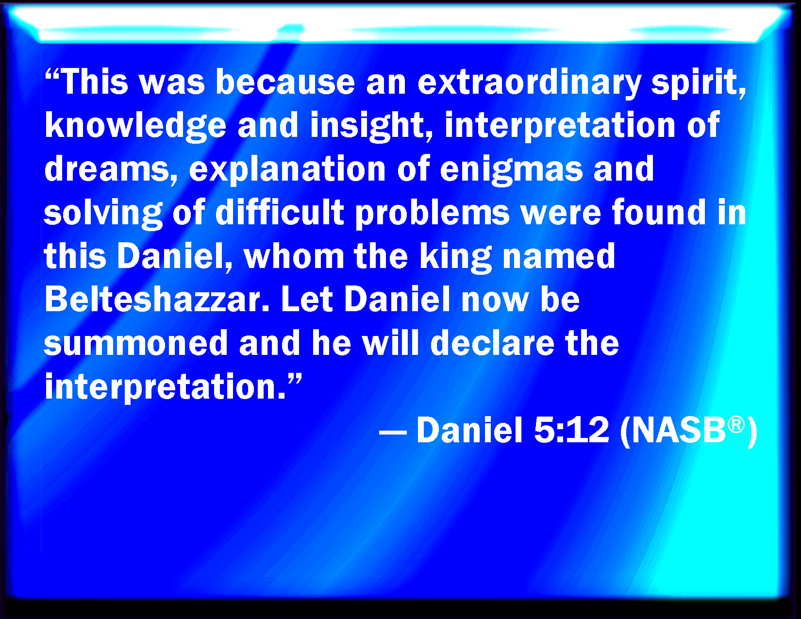 Bible Verse Slide Daniel 5:12 For as much as an excellent spirit, and knowledge, and understanding, interpreting of dreams, and showing of hard sentences, and dissolving of doubts, were found in the same Daniel, whom the king named Belteshazzar: now let Daniel be called, and he will show the interpretation. KJV: Forasmuch as an excellent spirit, and knowledge, and understanding, interpreting of dreams, and shewing of hard sentences, and dissolving of doubts, were found in the same Daniel, whom the king named Belteshazzar: now let Daniel be called, and he will shew the interpretation. DRB: Because a greater spirit, and knowledge, and understanding, and interpretation of dreams, and shewing of secrets, and resolving of difficult things, were found in him, that is, in Daniel: whom the king named Baltarsar. Now therefore let Daniel be called for, and he will tell the interpretation. DBT: forasmuch as an excellent spirit, and knowledge, and understanding, interpreting of dreams, and shewing of hard sentences, and solving of problems, were found in the same Daniel, whom the king named Belteshazzar. Now let Daniel be called, and he will shew the interpretation. ERV: forasmuch as an excellent spirit, and knowledge, and understanding, interpreting of dreams, and shewing of dark sentences, and dissolving of doubts, were found in the same Daniel, whom the king named Belteshazzar. Now let Daniel be called, and he will shew the interpretation. WBT: Forasmuch as an excellent spirit, and knowledge, and understanding, the interpreting of dreams, and showing of hard sentences, and dissolving of doubts, were found in the same Daniel, whom the king named Belteshazzar: now let Daniel be called, and he will show the interpretation. WEB: because an excellent spirit, and knowledge, and understanding, interpreting of dreams, and showing of dark sentences, and dissolving of doubts, were found in the same Daniel, whom the king named Belteshazzar. Now let Daniel be called, and he will show the interpretation. YLT: because that an excellent spirit, and knowledge, and understanding, interpreting of dreams, and showing of enigmas, and loosing of knots was found in him, in Daniel, whose name the king made Belteshazzar: now let Daniel be called, and the interpretation he doth show.'Links Daniel 5:12 NIV • Daniel 5:12 NLT • Daniel 5:12 ESV • Daniel 5:12 NASB • Daniel 5:12 KJV • Daniel 5:12 Interlinear • Daniel 5:12 Commentaries • Daniel 5:12 Parallel Texts • Daniel 5:12 Bible Apps • Daniel 5:12 Parallel • Bible Hub |
