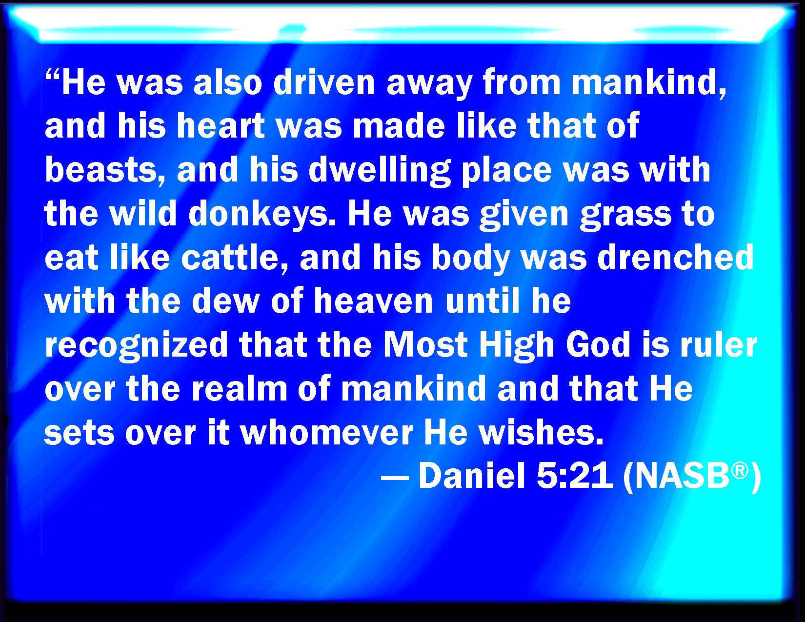 Daniel 5:21 And he was driven from the sons of men; and his heart was made like the beasts, and his dwelling was with the wild asses: they fed him with grass like oxen, and his body was wet with the dew of heaven; till he knew that the most high God ruled in the kingdom of men, and that he appoints over it whomsoever he will.