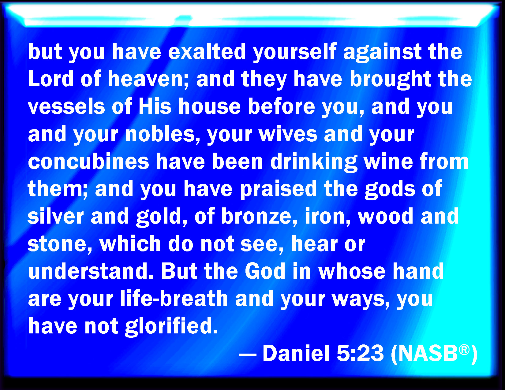 Bible Verse Slide Daniel 5:23 But have lifted up yourself against the Lord of heaven; and they have brought the vessels of his house before you, and you, and your lords, your wives, and your concubines, have drunk wine in them; and you have praised the gods of silver, and gold, of brass, iron, wood, and stone, which see not, nor hear, nor know: and the God in whose hand your breath is, and whose are all your ways, have you not glorified: KJV: But hast lifted up thyself against the Lord of heaven; and they have brought the vessels of his house before thee, and thou, and thy lords, thy wives, and thy concubines, have drunk wine in them; and thou hast praised the gods of silver, and gold, of brass, iron, wood, and stone, which see not, nor hear, nor know: and the God in whose hand thy breath is, and whose are all thy ways, hast thou not glorified: DRB: But hast lifted thyself up against the Lord of heaven: and the vessels of his house have been brought before thee: and thou, and thy nobles, and thy wives, and thy concubines have drunk wine in them: and thou hast praised the gods of silver, and of gold, and of brass, of iron, and of wood, and of stone, that neither see, nor hear, nor feel: but the God who hath thy breath in his hand, and all thy ways, thou hast not glorified. DBT: but hast lifted up thyself against the Lord of the heavens; and they have brought the vessels of his house before thee, and thou and thy nobles, thy wives and thy concubines, have drunk wine in them; and thou hast praised the gods of silver and gold, of brass, iron, wood, and stone, which see not, nor hear, nor know; and the God in whose hand thy breath is, and whose are all thy ways, hast thou not glorified: ERV: but hast lifted up thyself against the Lord of heaven; and they have brought the vessels of his house before thee, and thou and thy lords, thy wives and thy concubines, have drunk wine in them; and thou hast praised the gods of silver, and gold, of brass, iron, wood, and stone, which see not, nor hear, nor know: and the God in whose hand thy breath is, and whose are all thy ways, hast thou not glorified: WBT: But hast lifted up thyself against the Lord of heaven; and they have brought the vessels of his house before thee, and thou, and thy lords, thy wives, and thy concubines, have drank wine in them; and thou hast praised the gods of silver, and gold, of brass, iron, wood, and stone, which see not, nor hear, nor know: and the God in whose hand thy breath is, and whose are all thy ways, thou hast not glorified. WEB: but have lifted up yourself against the Lord of heaven; and they have brought the vessels of his house before you, and you and your lords, your wives and your concubines, have drunk wine from them; and you have praised the gods of silver and gold, of brass, iron, wood, and stone, which don't see, nor hear, nor know; and the God in whose hand your breath is, and whose are all your ways, you have not glorified. YLT: and against the Lord of the heavens thou hast lifted up thyself; and the vessels of His house they have brought in before thee, and thou, and thy great men, thy wives, and thy concubines, are drinking wine with them, and gods of silver, and of gold, of brass, of iron, of wood, and of stone, that are not seeing, nor hearing, nor knowing, thou hast praised: and the God in whose hand is thy breath, and all thy ways, Him thou hast not honoured.Links Daniel 5:23 NIV • Daniel 5:23 NLT • Daniel 5:23 ESV • Daniel 5:23 NASB • Daniel 5:23 KJV • Daniel 5:23 Interlinear • Daniel 5:23 Commentaries • Daniel 5:23 Parallel Texts • Daniel 5:23 Bible Apps • Daniel 5:23 Parallel • Bible Hub |