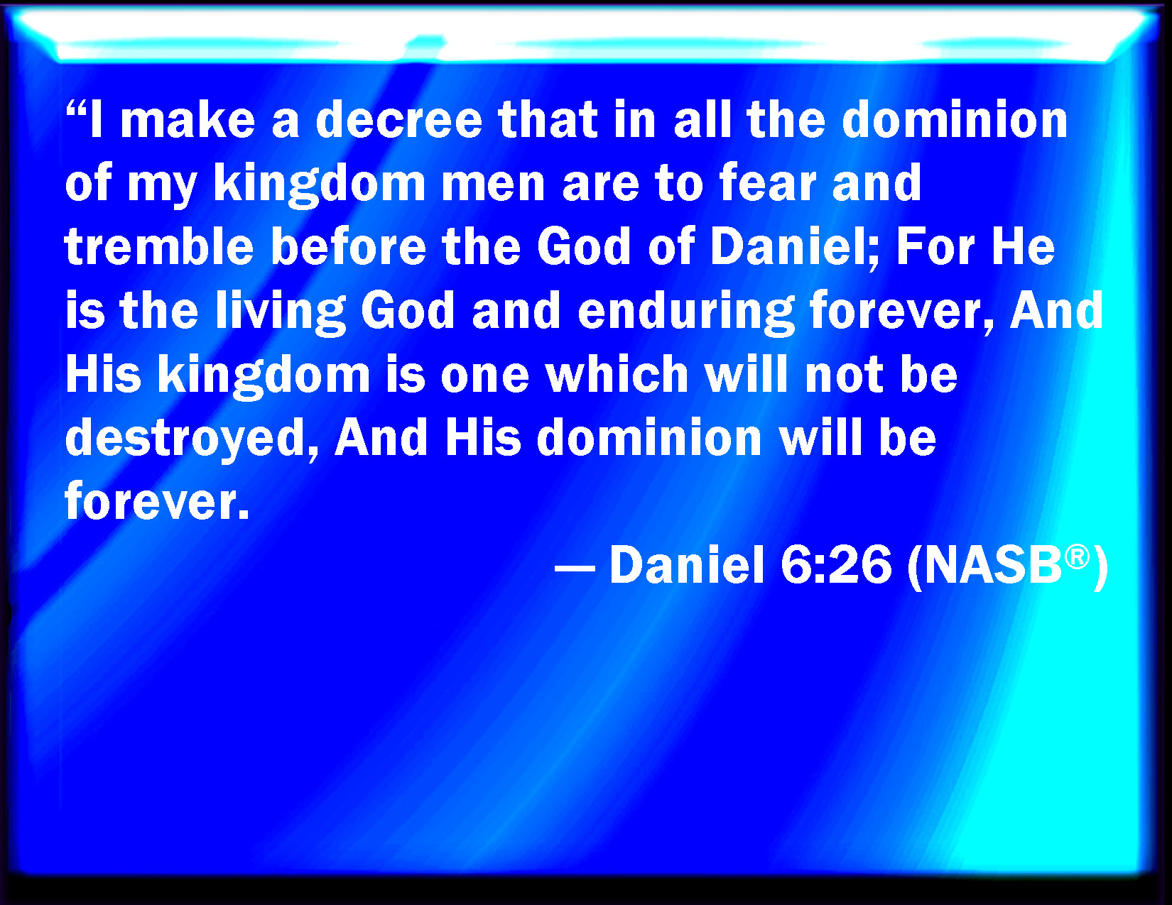 Bible Verse Slide Daniel 6:26 I make a decree, That in every dominion of my kingdom men tremble and fear before the God of Daniel: for he is the living God, and steadfast for ever, and his kingdom that which shall not be destroyed, and his dominion shall be even to the end. KJV: I make a decree, That in every dominion of my kingdom men tremble and fear before the God of Daniel: for he is the living God, and stedfast for ever, and his kingdom that which shall not be destroyed, and his dominion shall be even unto the end. DRB: It is decreed by me, that in all my empire and my kingdom all men dread and fear the God of Daniel. For he is the living and eternal God for ever: and his kingdom shall not be destroyed, and his power shall be for ever. DBT: I make a decree, That in every dominion of my kingdom men tremble and fear before the God of Daniel; for he is the living God, and steadfast for ever, and his kingdom that which shall not be destroyed, and his dominion shall be even unto the end. ERV: I make a decree, that in all the dominion of my kingdom men tremble and fear before the God of Daniel: for he is the living God, and stedfast for ever, and his kingdom that which shall not be destroyed, and his dominion shall be even unto the end: WBT: I make a decree, That in every dominion of my kingdom men tremble and fear before the God of Daniel: for he is the living God, and steadfast for ever, and his kingdom that which shall not be destroyed, and his dominion shall be even to the end. WEB: I make a decree, that in all the dominion of my kingdom men tremble and fear before the God of Daniel; for he is the living God, and steadfast forever, His kingdom that which shall not be destroyed; and his dominion shall be even to the end. YLT: From before me is made a decree, that in every dominion of my kingdom they are trembling and fearing before the God of Daniel, for He is the living God, and abiding to the ages, and His kingdom that which is not destroyed, and His dominion is unto the end.Links Daniel 6:26 NIV • Daniel 6:26 NLT • Daniel 6:26 ESV • Daniel 6:26 NASB • Daniel 6:26 KJV • Daniel 6:26 Interlinear • Daniel 6:26 Commentaries • Daniel 6:26 Parallel Texts • Daniel 6:26 Bible Apps • Daniel 6:26 Parallel • Bible Hub |