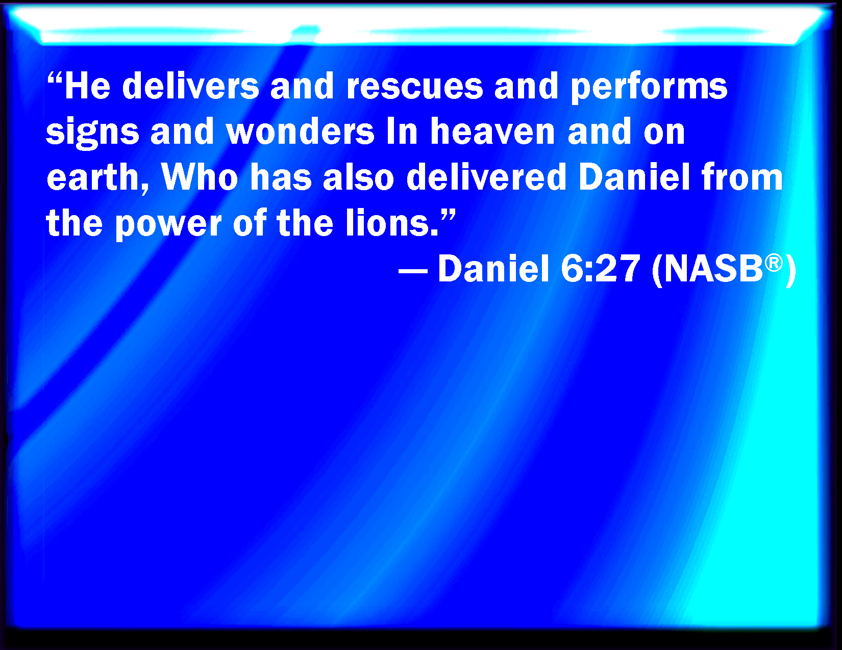Bible Verse Slide Daniel 6:27 He delivers and rescues, and he works signs and wonders in heaven and in earth, who has delivered Daniel from the power of the lions. KJV: He delivereth and rescueth, and he worketh signs and wonders in heaven and in earth, who hath delivered Daniel from the power of the lions. DRB: He is the deliverer, and saviour, doing signs and wonders in heaven, and in earth: who hath delivered Daniel out of the lions' den. DBT: He saveth and delivereth, and he worketh signs and wonders in the heavens and on the earth: who hath saved Daniel from the power of the lions. ERV: He delivereth and rescueth, and he worketh signs and wonders in heaven and in earth; who hath delivered Daniel from the power of the lions. WBT: He delivereth and rescueth, and he worketh signs and wonders in heaven and on earth, who hath delivered Daniel from the power of the lions. WEB: He delivers and rescues, and he works signs and wonders in heaven and in earth, who has delivered Daniel from the power of the lions. YLT: A deliverer, and rescuer, and doer of signs and wonders in the heavens and in earth is He who hath delivered Daniel from the paw of the lions.'Links Daniel 6:27 NIV • Daniel 6:27 NLT • Daniel 6:27 ESV • Daniel 6:27 NASB • Daniel 6:27 KJV • Daniel 6:27 Interlinear • Daniel 6:27 Commentaries • Daniel 6:27 Parallel Texts • Daniel 6:27 Bible Apps • Daniel 6:27 Parallel • Bible Hub |